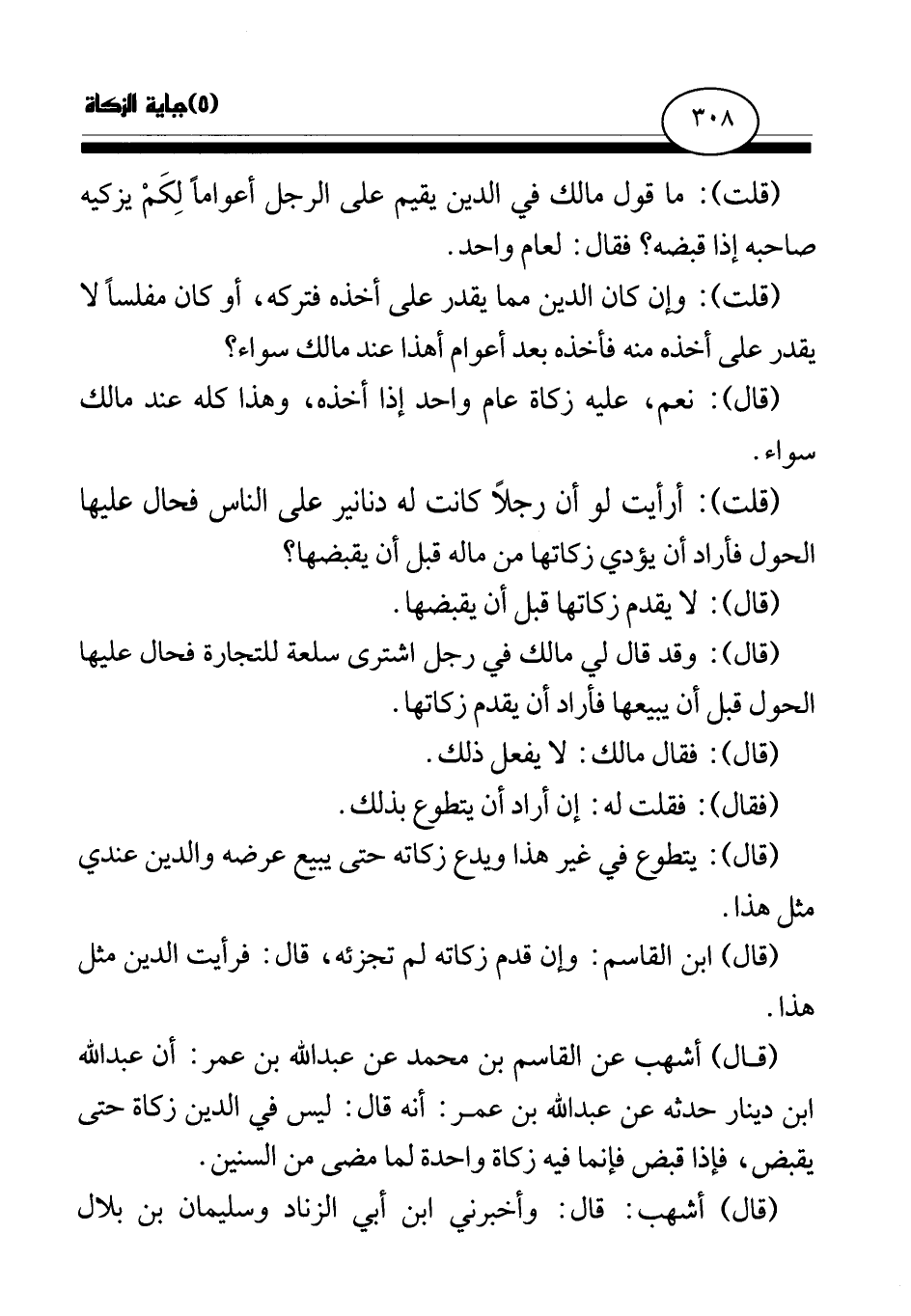 (قلت) : ما قول مالك في الدين يقيم على الرجل أعواما لكم يزكيه صاحبه إذا قبضه؟ فقال: لعام واحد.