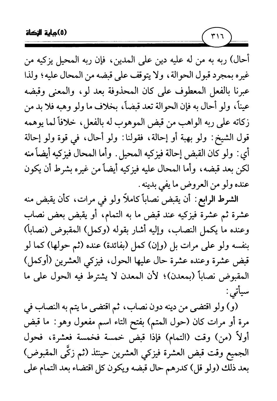 الشرط الرابع: أن يقبض نصابا كاملا ولو في مرات، كأن يقبض منه عشرة ثم عشرة فيزكيه عند قبض ما به التمام، أو يقبض بعض نصاب وعنده ما يكمل النصاب، وإليه أشار بقوله (وكمل) المقبوض (نصابا، بنفسه ولو على مرات بل (وإن) كمل (بفائدة) عنده (ثم حولها) كما لو قبض عشرة وعنده عشرة حال عليها الحول، فيزكي العشرين (أو كمل) المقبوض نصابا (بمعدن) ؛ لأن المعدن لا يشترط فيه الحول على ما سيأتي: