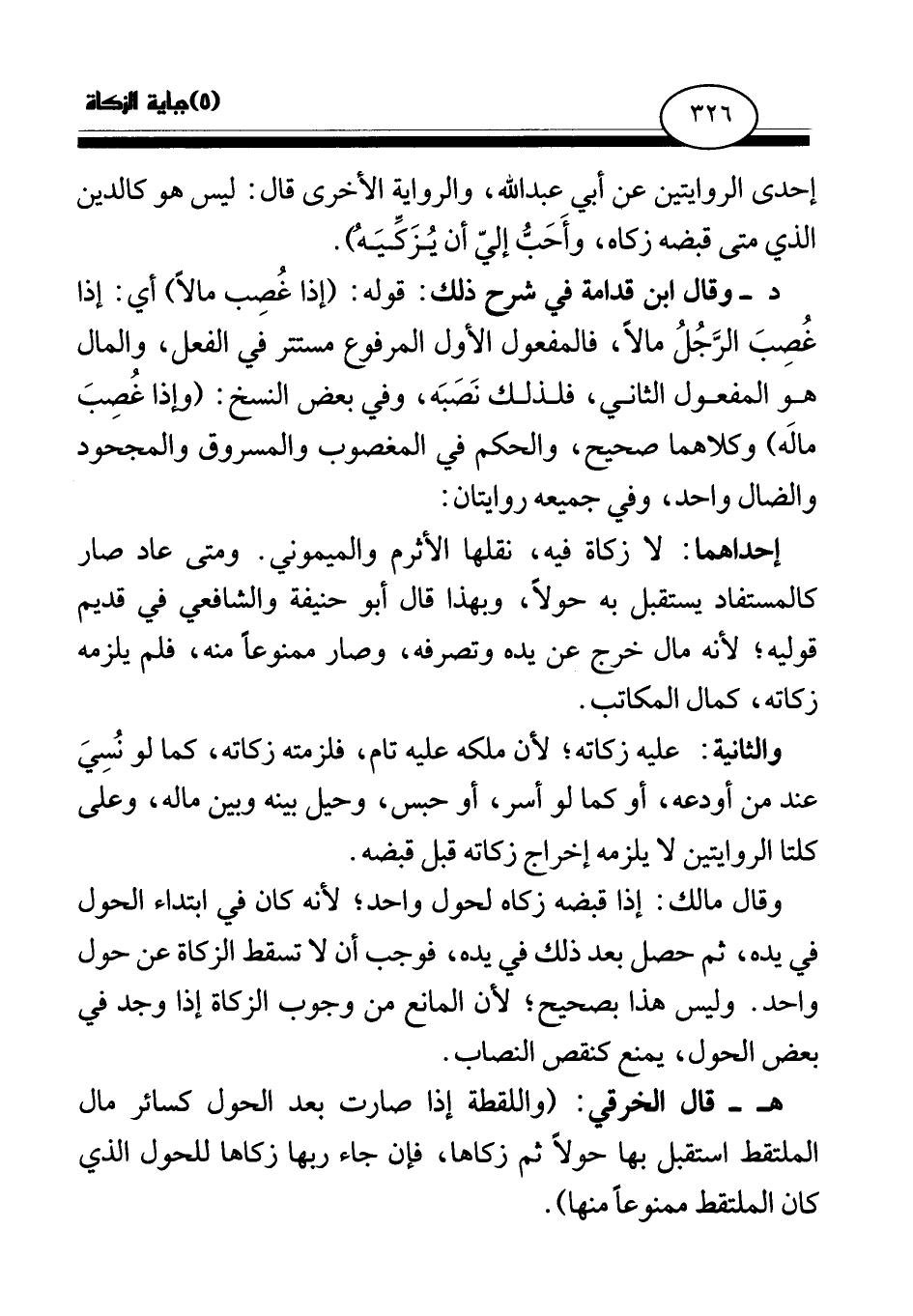 د- وقال ابن قدامة في شرح ذلك: قوله: (إذا غصب مالا) أي: إذا غصب الرجل مالا، فالمفعول الأول المرفوع مستتر في الفعل، والمال هو المفعول الثاني، فلذلك نصبه، وفي بعض النسخ: (وإذا غصب ماله) وكلاهما صحيح، والحكم في المغصوب والمسروق والمجحود والضال واحد، وفي جميعه روايتان: