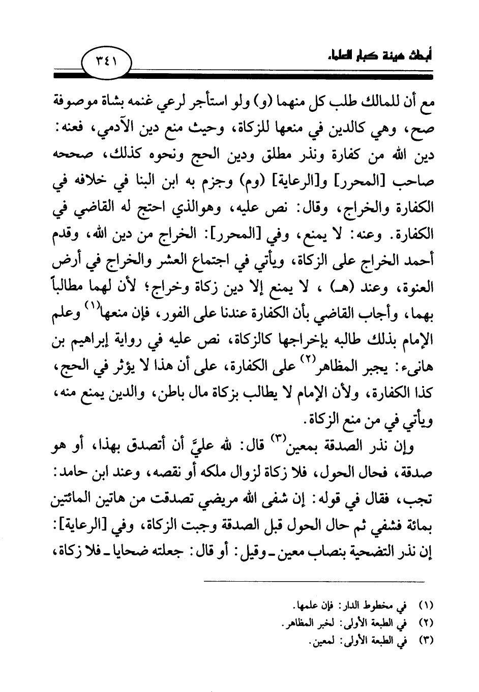 مع أن للمالك طلب كل منهما (و) ولو استأجر لرعي غنمه بشاة موصوفة صح، وهي كالدين في منعها للزكاة، وحيث منع دين الآدمي، فعنه: دين الله من كفارة ونذر مطلق ودين الحج ونحوه كذلك، صححه صاحب [المحرر] و [الرعاية] (وم) وجزم به ابن البنا في خلافه في الكفارة والخراج، وقال: نص عليه، وهو الذي احتج له القاضي في الكفارة. وعنه: لا يمنع، وفي [المحرر] : الخراج من دين الله، وقدم أحمد الخراج على الزكاة، ويأتي في اجتماع العشر والخراج في أرض العنوة، وعند (هـ) ، لا يمنع إلا دين زكاة وخراج؛ لأن لهما مطالبا بهما، وأجاب القاضي بأن الكفارة عندنا على الفور، فإن منعها (¬1) وعلم الإمام بذلك طالبه بإخراجها كالزكاة، نص عليه في رواية إبراهيم بن هانئ: يجبر المظاهر (¬2) على الكفارة، على أن هذا لا يؤثر في الحج، كذا الكفارة، ولأن الإمام لا يطالب بزكاة مال باطن، والدين يمنع منه، ويأتي في من منع الزكاة.