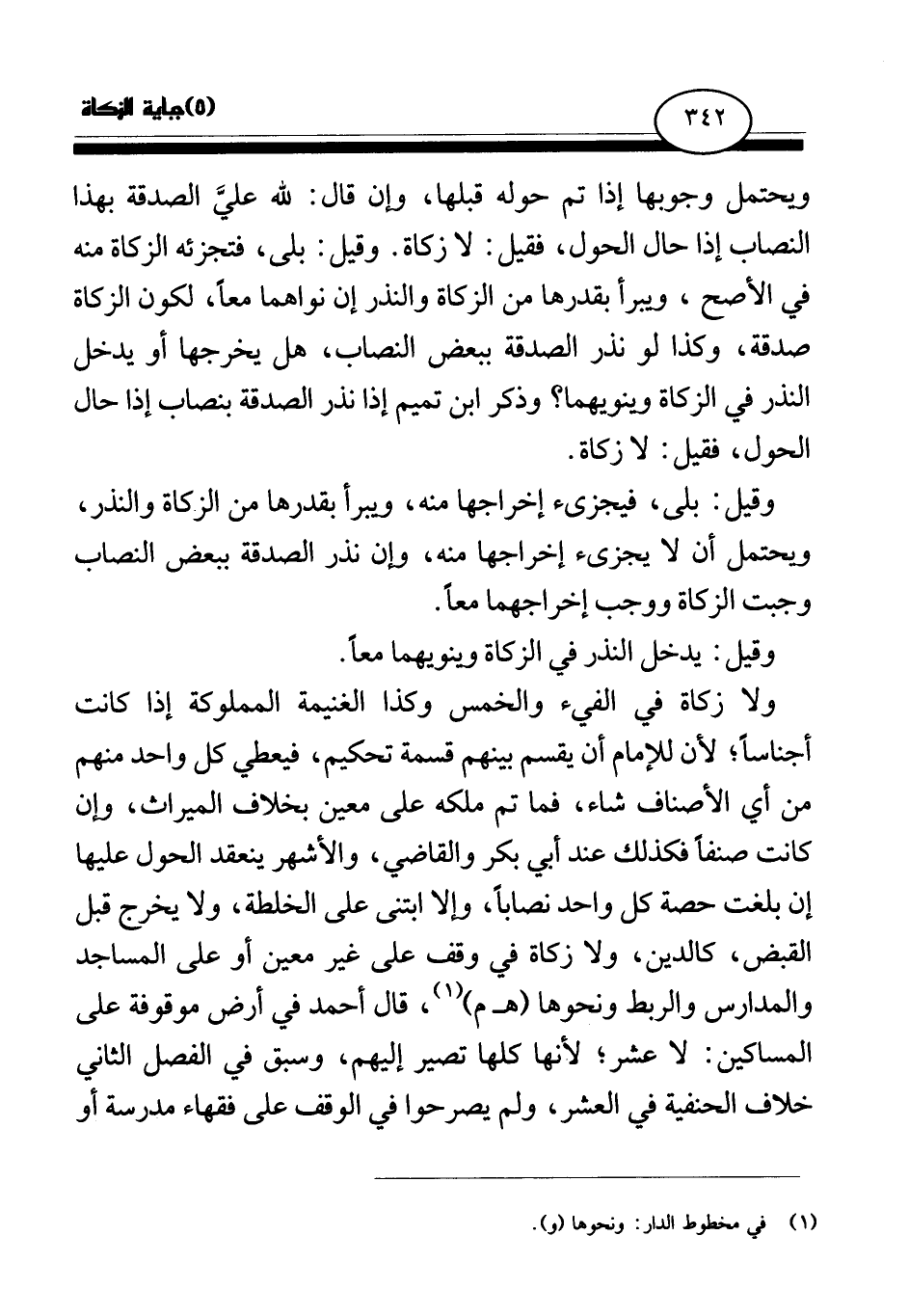 ويحتمل وجوبها إذا تم حوله قبلها، وإن قال: لله علي الصدقة بهذا النصاب إذا حال الحول، فقيل: لا زكاة. وقيل: بلى، فتجزئه الزكاة منه في الأصح، ويبرأ بقدرها من الزكاة والنذر إن نواهما معا، لكون الزكاة صدقة، وكذا لو نذر الصدقة ببعض النصاب، هل يخرجها أو يدخل النذر في الزكاة وينويهما؟ وذكر ابن تميم إذا نذر الصدقة بنصاب إذا حال الحول، فقيل: لا زكاة.