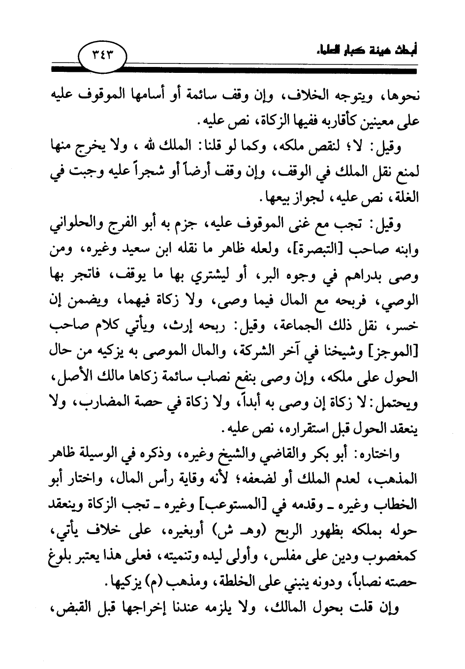وقيل: تجب مع غنى الموقوف عليه، جزم به أبو الفرج والحلواني وابنه صاحب [التبصرة] ، ولعله ظاهر ما نقله ابن سعيد وغيره، ومن وصى بدراهم في وجوه البر، أو ليشتري بها ما يوقف، فاتجر بها الوصي، فربحه مع المال فيما وصى، ولا زكاة فيهما، ويضمن إن خسر، نقل ذلك الجماعة، وقيل: ربحه إرث، ويأتي كلام صاحب [الموجز] وشيخنا في آخر الشركة، والمال الموصى به يزكيه من حال الحول على ملكه، وإن وصى بنفع نصاب سائمة زكاها مالك الأصل، ويحتمل: لا زكاة إن وصى به أبدا، ولا زكاة في حصة المضارب، ولا ينعقد الحول قبل استقراره، نص عليه.