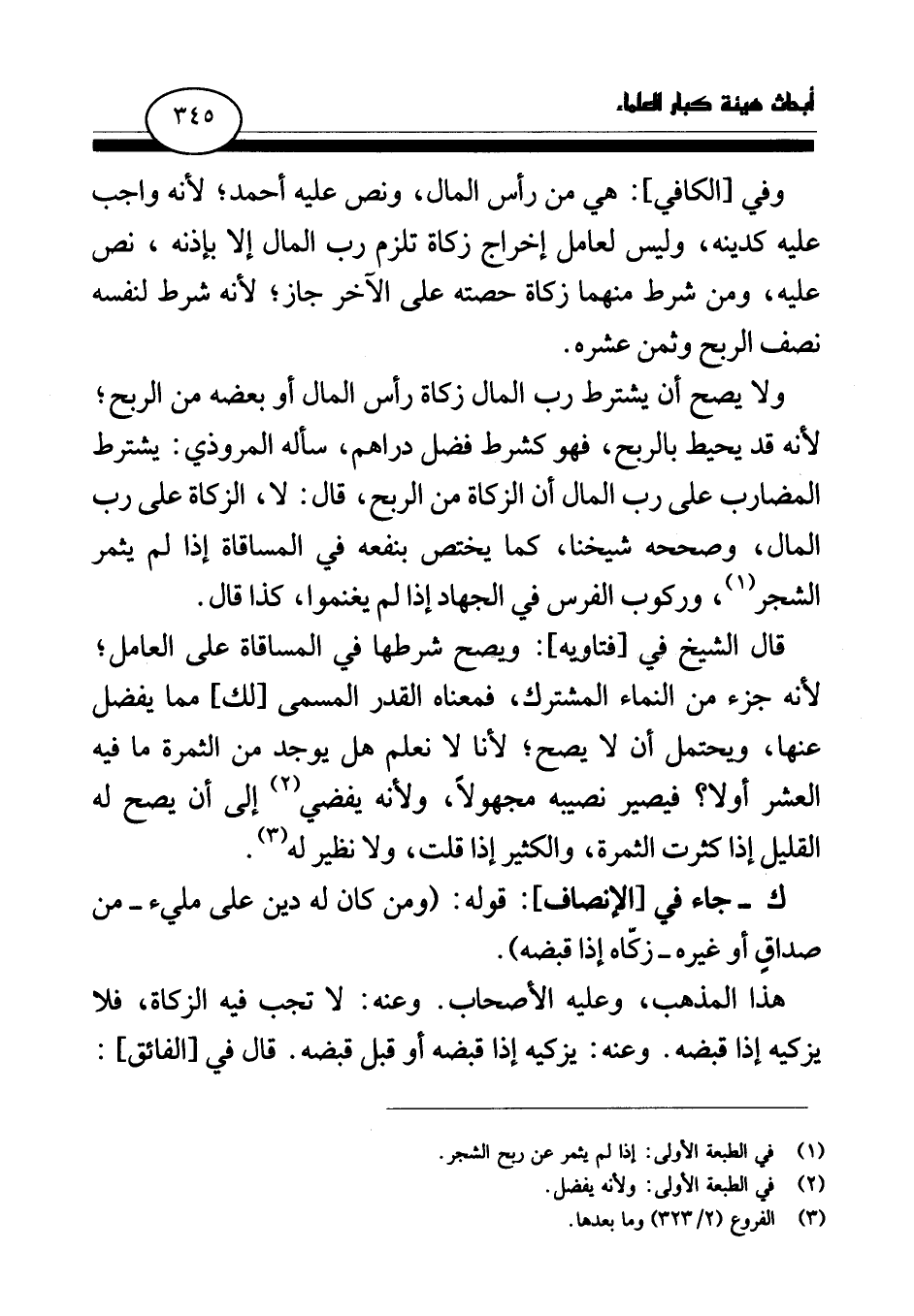 وفي [الكافي] : هي من رأس المال، ونص عليه أحمد؛ لأنه واجب عليه كدينه، وليس لعامل إخراج زكاة تلزم رب المال إلا بإذنه، نص عليه، ومن شرط منهما زكاة حصته على الآخر جاز؛ لأنه شرط لنفسه نصف الربح وثمن عشره.