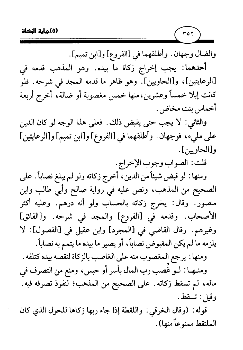 ومنها: لو قبض شيئا من الدين، أخرج زكاته ولو لم يبلغ نصابا. على الصحيح من المذهب، ونص عليه في رواية صالح وأبي طالب وابن منصور. وقال: يخرج زكاته بالحساب ولو أنه درهم. وعليه أكثر الأصحاب. وقدمه في [الفروع] والمجد في شرحه. و [الفائق] وغيرهم. وقال القاضي في [المجرد] وابن عقيل في [الفصول] : لا يلزمه ما لم يكن المقبوض نصابا، أو يصير ما بيده ما يتمم به نصابا.