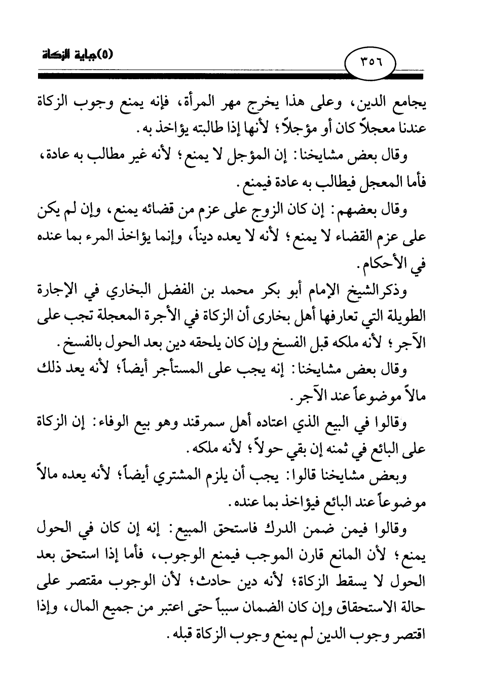وذكر الشيخ الإمام أبو بكر محمد بن الفضل البخاري في الإجارة الطويلة التي تعارفها أهل بخارى أن الزكاة في الأجرة المعجلة تجب على الآجر؛ لأنه ملكه قبل الفسخ وإن كان يلحقه دين بعد الحول بالفسخ. وقال بعض مشايخنا: إنه يجب على المستأجر أيضا؛ لأنه يعد ذلك مالا موضوعا عند الآجر.