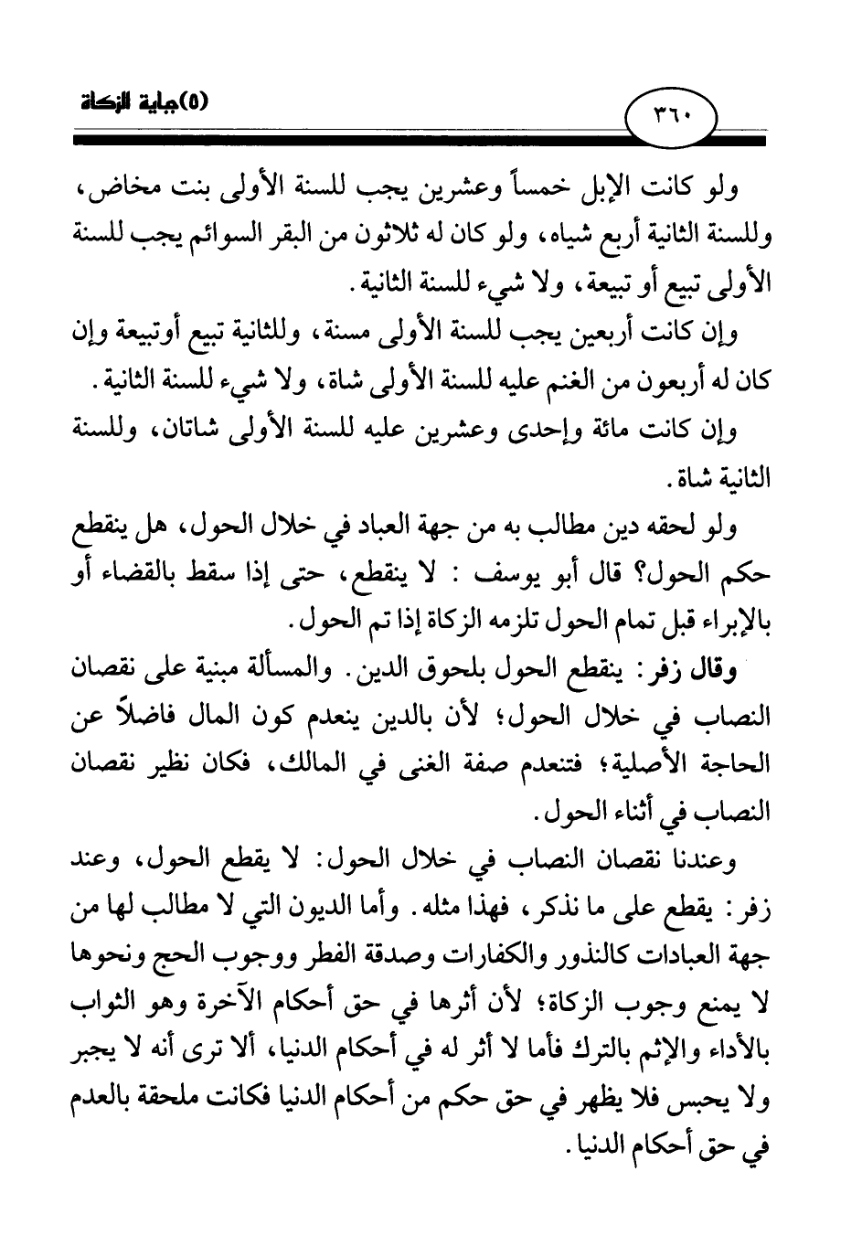 ولو لحقه دين مطالب به من جهة العباد في خلال الحول، هل ينقطع حكم الحول؟ قال أبو يوسف: لا ينقطع، حتى إذا سقط بالقضاء أو بالإبراء قبل تمام الحول تلزمه الزكاة إذا تم الحول.