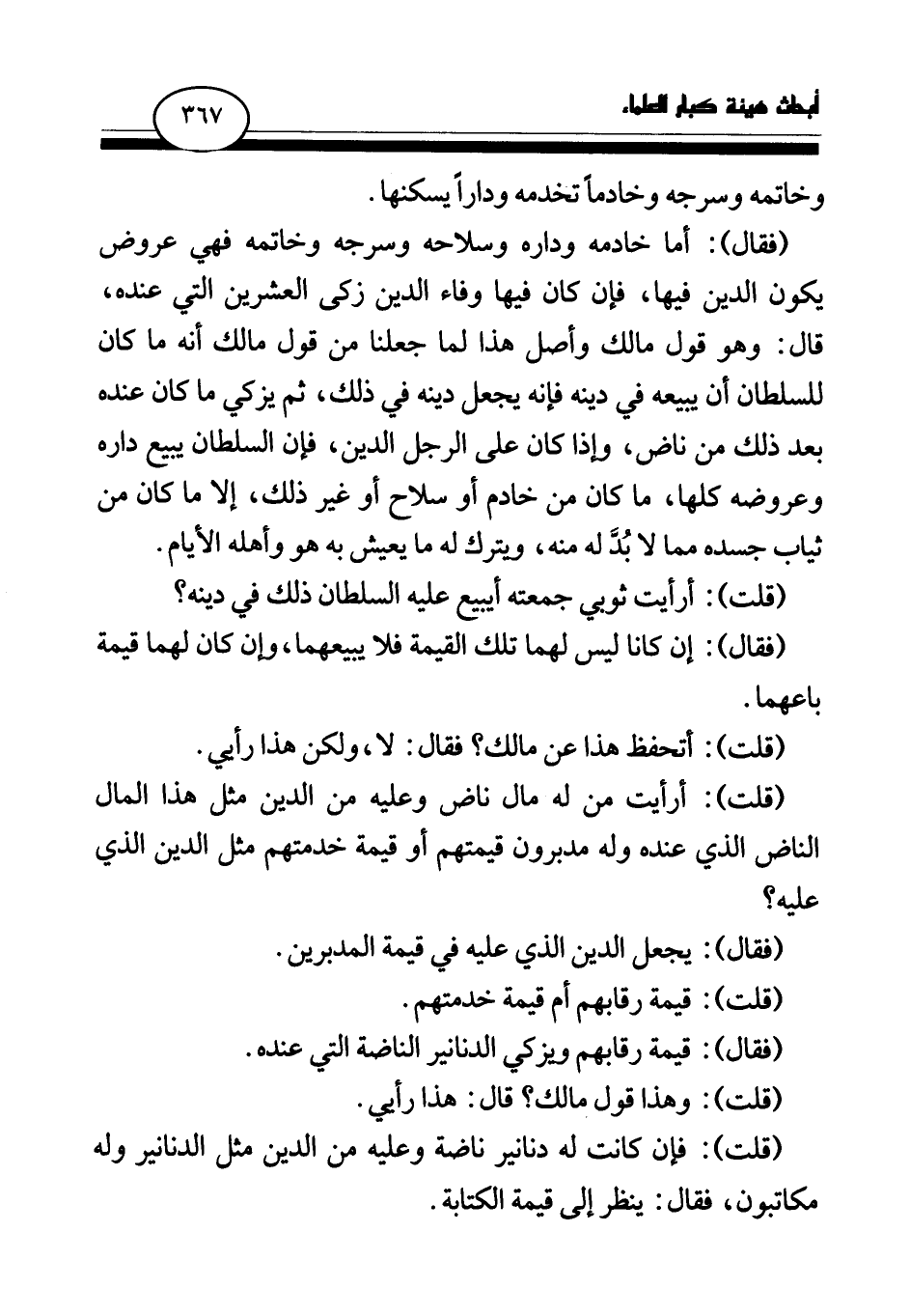 (فقال) : أما خادمه وداره وسلاحه وسرجه وخاتمه فهي عروض يكون الدين فيها، فإن كان فيها وفاء الدين زكى العشرين التي عنده، قال: وهو قول مالك وأصل هذا لما جعلنا من قول مالك أنه ما كان للسلطان أن يبيعه في دينه فإنه يجعل دينه في ذلك، ثم يزكي ما كان عنده بعد ذلك من ناض، وإذا كان على الرجل الدين، فإن السلطان يبيع داره وعروضه كلها، ما كان من خادم أو سلاح أو غير ذلك، إلا ما كان من ثياب جسده مما لا بد له منه، ويترك له ما يعيش به هو وأهله الأيام. (قلت) : أرأيت ثوبي جمعته أيبيع عليه السلطان ذلك في دينه؟