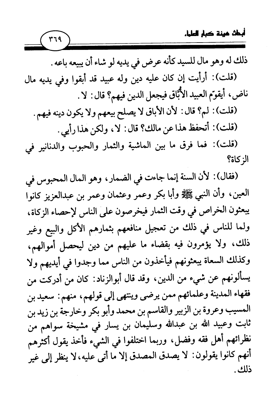 (فقال) : لأن السنة إنما جاءت في الضمار، وهو المال المحبوس في العين، وأن النبي صلى الله عليه وسلم وأبا بكر وعمر وعثمان وعمر بن عبد العزيز كانوا يبعثون الخراص في وقت الثمار فيخرصون على الناس لإحصاء الزكاة، ولما للناس في ذلك من تعجيل منافعهم بثمارهم الأكل والبيع وغير ذلك، ولا يؤمرون فيه بقضاء ما عليهم من دين ليحصل أموالهم، وكذلك السعاة يبعثونهم فيأخذون من الناس مما وجدوا في أيديهم ولا يسألونهم عن شيء من الدين، وقد قال أبو الزناد: كان من أدركت من فقهاء المدينة وعلمائهم ممن يرضى وينتهي إلى قولهم، منهم: سعيد بن المسيب وعروة بن الزبير والقاسم بن محمد وأبو بكر وخارجة بن زيد بن ثابت وعبيد الله بن عبد الله وسليمان بن يسار في مشيخة سواهم من نظرائهم أهل فقه وفضل، وربما اختلفوا في الشيء فأخذ يقول أكثرهم أنهم كانوا يقولون: لا يصدق المصدق إلا ما أتى عليه، لا ينظر إلى غير ذلك.