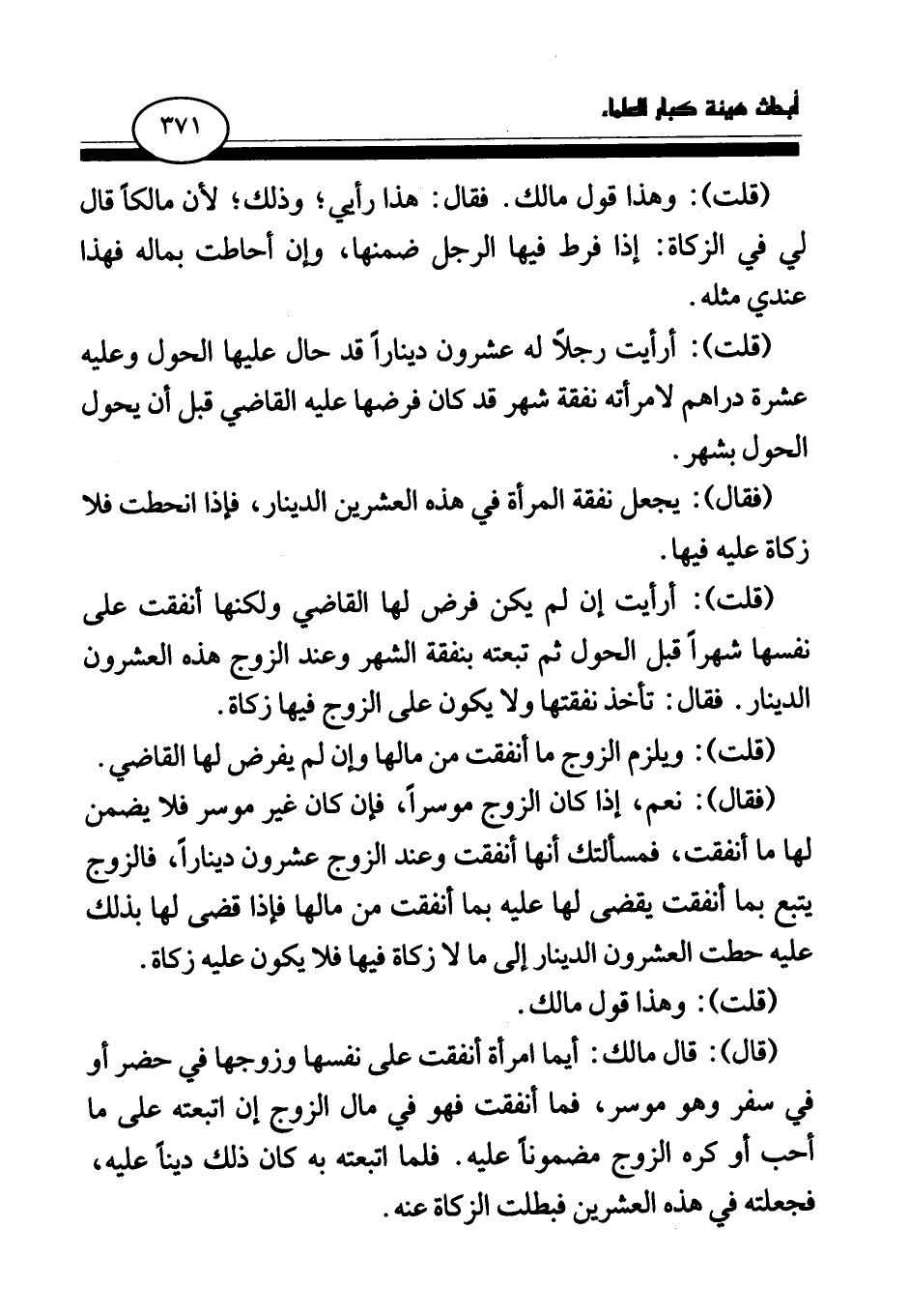 (قلت) : أرأيت إن لم يكن فرض لها القاضي ولكنها أنفقت على نفسها شهرا قبل الحول ثم تبعته بنفقة الشهر وعند الزوج هذه العشرون الدينار. فقال: تأخذ نفقتها ولا يكون على الزوج فيها زكاة.
