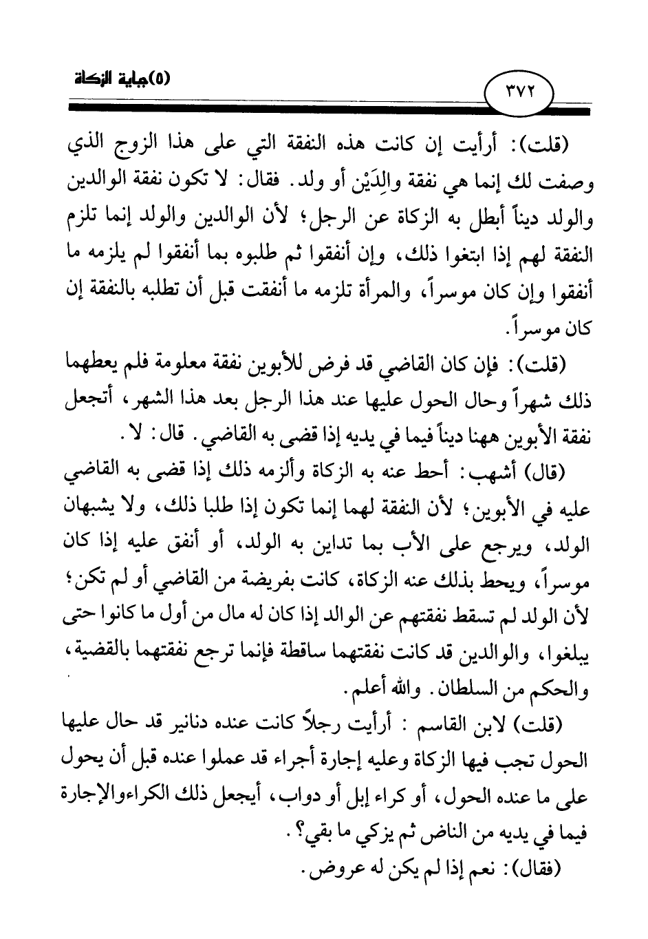(قلت) : فإن كان القاضي قد فرض للأبوين نفقة معلومة فلم يعطهما ذلك شهرا وحال الحول عليها عند هذا الرجل بعد هذا الشهر، أتجعل نفقة الأبوين ههنا دينا فيما في يديه إذا قضى به القاضي. قال: لا.