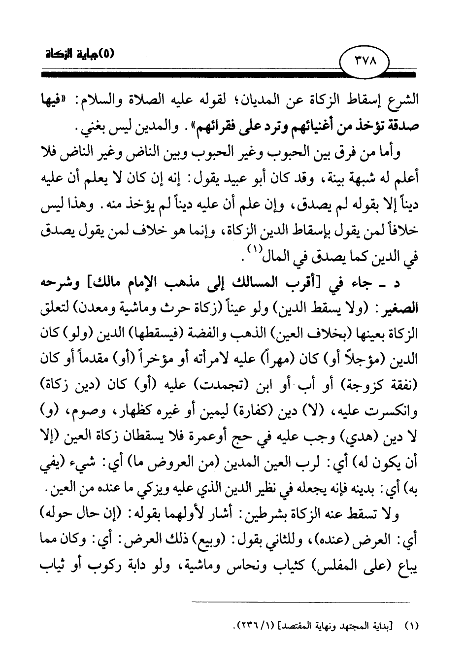 د- جاء في [أقرب المسالك إلى مذهب الإمام مالك] وشرحه الصغير: (ولا يسقط الدين) ولو عينا (زكاة حرث وماشية ومعدن) لتعلق الزكاة بعينها (بخلاف العين) الذهب والفضة (فيسقطها) الدين (ولو) كان الدين (مؤجلا أو) كان (مهرا، عليه لامرأته أو مؤخرا (أو) مقدما أو كان (نفقة كزوجة) أو أب أو ابن (تجمدت) عليه (أو) كان (دين زكاة) وانكسرت عليه، (لا) دين (كفارة) ليمين أو غيره كظهار، وصوم، (و) لا دين (هدي) وجب عليه في حج أو عمرة فلا يسقطان زكاة العين (إلا أن يكون له) أي: لرب العين المدين (من العروض ما) أي: شيء (يفي به) أي: بدينه فإنه يجعله في نظير الدين الذي عليه ويزكي ما عنده من العين. ولا تسقط عنه الزكاة بشرطين: أشار لأولهما بقوله: (إن حال حوله) أي: العرض (عنده) ، وللثاني بقول: (وبيع) ذلك العرض: أي: وكان مما يباع (على المفلس) كثياب ونحاس وماشية، ولو دابة ركوب أو ثياب