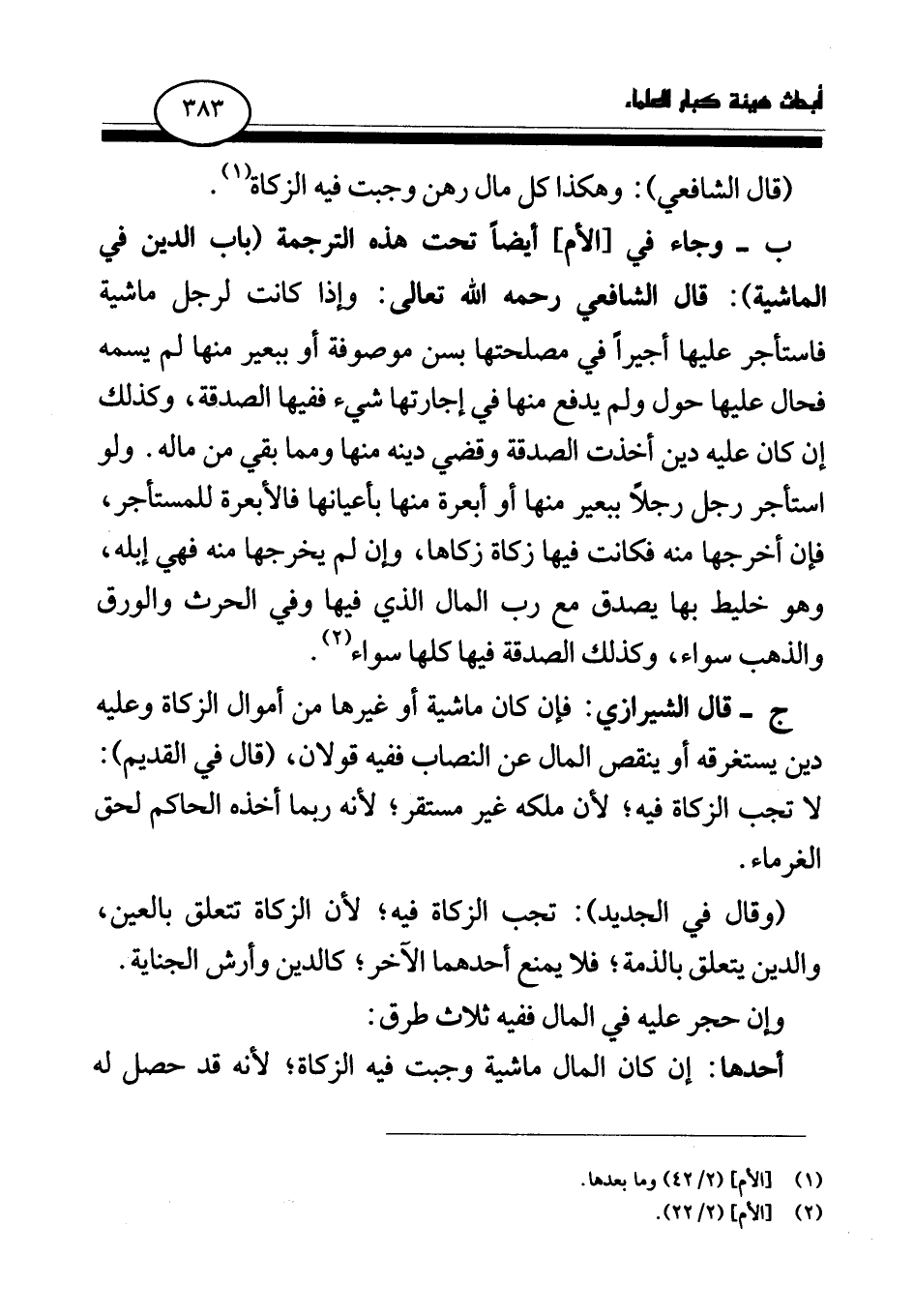 ب- وجاء في [الأم] أيضا تحت هذه الترجمة (باب الدين في الماشية) : قال الشافعي رحمه الله تعالى: وإذا كانت لرجل ماشية فاستأجر عليها أجيرا في مصلحتها بسن موصوفة أو ببعير منها لم يسمه فحال عليها حول ولم يدفع منها في إجارتها شيء ففيها الصدقة، وكذلك إن كان عليه دين أخذت الصدقة وقضي دينه منها ومما بقي من ماله. ولو استأجر رجل رجلا ببعير منها أو أبعرة منها بأعيانها فالأبعرة للمستأجر، فإن أخرجها منه فكانت فيها زكاة زكاها، وإن لم يخرجها منه فهي إبله، وهو خليط بها يصدق مع رب المال الذي فيها وفي الحرث والورق والذهب سواء، وكذلك الصدقة فيها كلها سواء (¬2) .