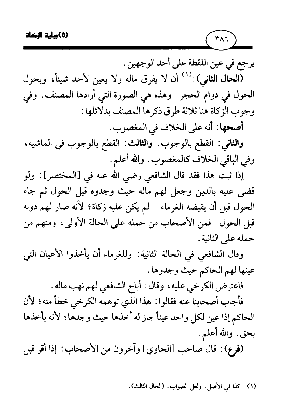 (الحال الثاني) : (¬1) أن لا يفرق ماله ولا يعين لأحد شيئا، ويحول الحول في دوام الحجر. وهذه هي الصورة التي أرادها المصنف. وفي وجوب الزكاة هنا ثلاثة طرق ذكرها المصنف بدلائلها: