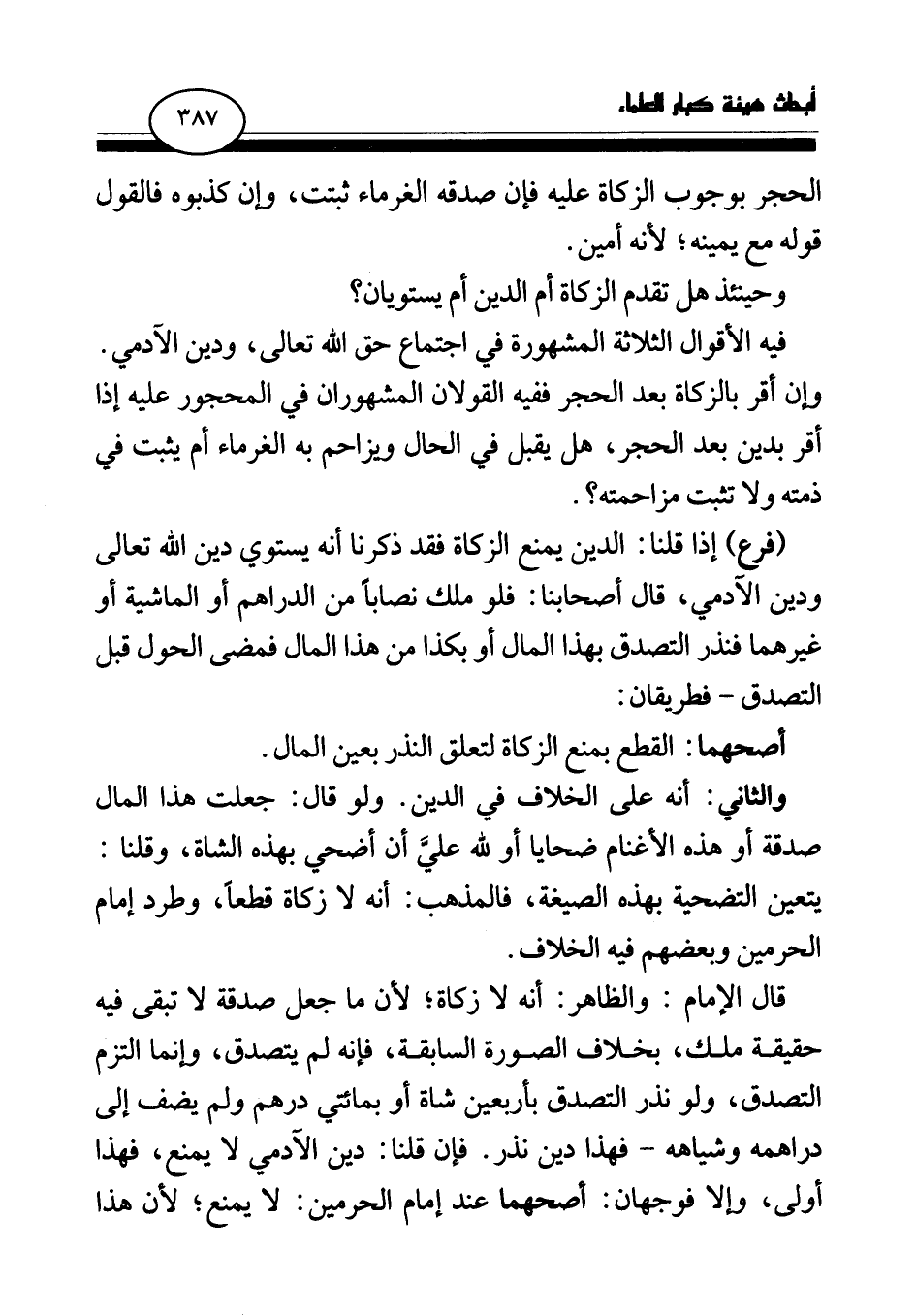 فيه الأقوال الثلاثة المشهورة في اجتماع حق الله تعالى، ودين الآدمي. وإن أقر بالزكاة بعد الحجر ففيه القولان المشهوران في المحجور عليه إذا أقر بدين بعد الحجر، هل يقبل في الحال ويزاحم به الغرماء أم يثبت في ذمته ولا تثبت مزاحمته؟
