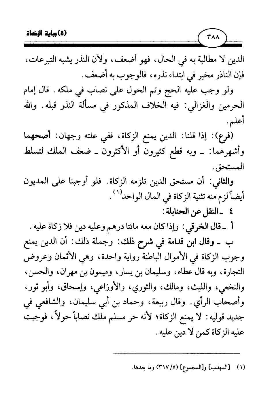 ب- وقال ابن قدامة في شرح ذلك: وجملة ذلك: أن الدين يمنع وجوب الزكاة في الأموال الباطنة رواية واحدة، وهي الأثمان وعروض التجارة، وبه قال عطاء، وسليمان بن يسار، وميمون بن مهران، والحسن، والنخعي، والليث، ومالك، والثوري، والأوزاعي، وإسحاق، وأبو ثور، وأصحاب الرأي. وقال ربيعة، وحماد بن أبي سليمان، والشافعي في جديد قوليه: لا يمنع الزكاة؛ لأنه حر مسلم ملك نصابا حولا، فوجبت عليه الزكاة كمن لا دين عليه.