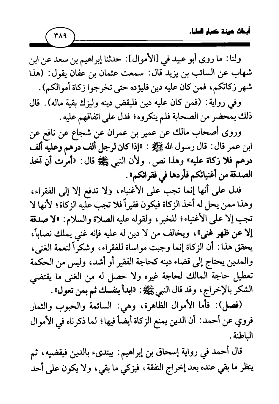 ولنا: ما روى أبو عبيد في [الأموال] : حدثنا إبراهيم بن سعد عن ابن شهاب عن السائب بن يزيد قال: سمعت عثمان بن عفان يقول: (هذا شهر زكاتكم، فمن كان عليه دين فليؤده حتى تخرجوا زكاة أموالكم) . وفي رواية: (فمن كان عليه دين فليقض دينه وليزك بقية ماله) . قال ذلك بمحضر من الصحابة فلم ينكروه؟ فدل على اتفاقهم عليه.