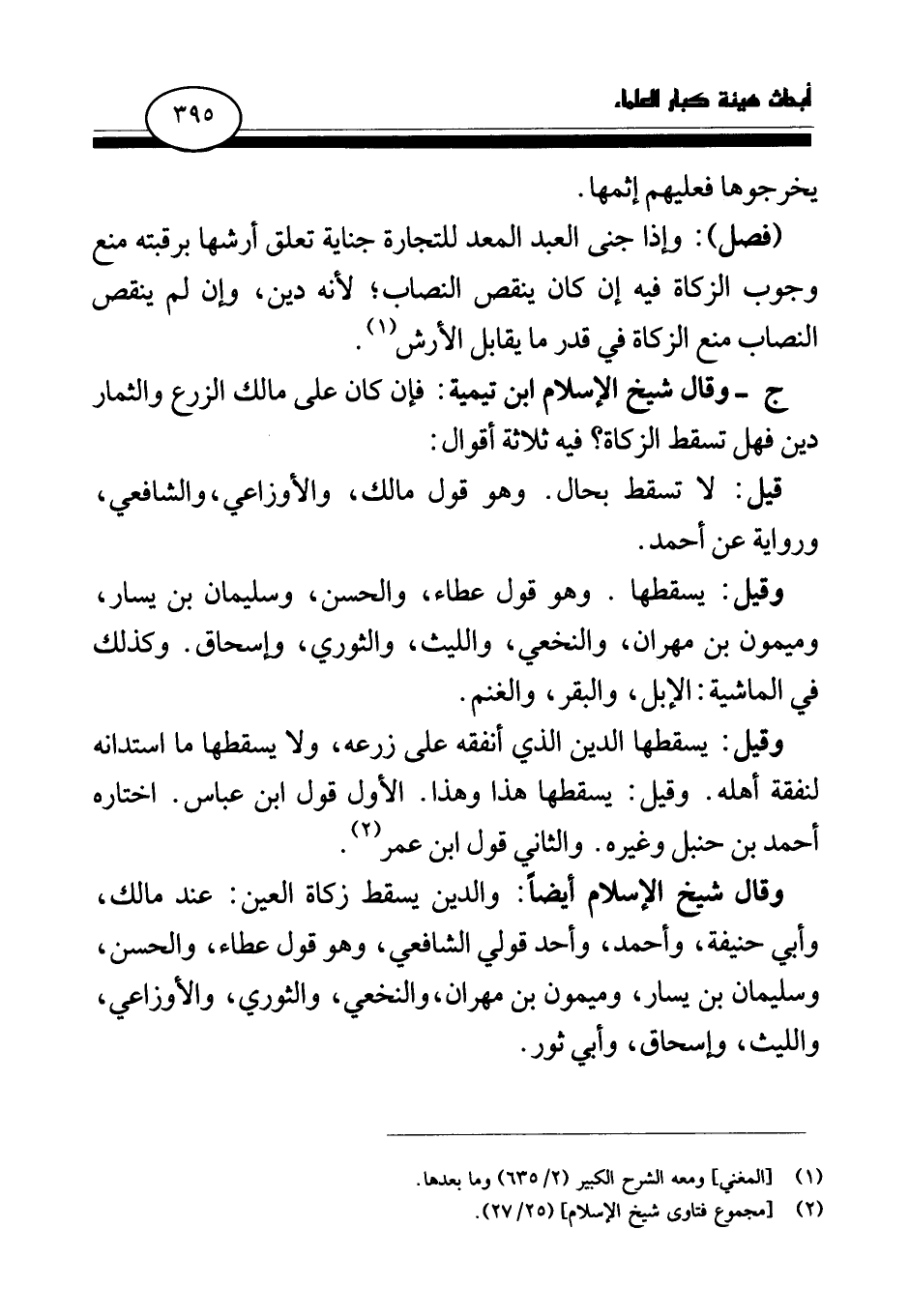 وقال شيخ الإسلام أيضا: والدين يسقط زكاة العين: عند مالك، وأبي حنيفة، وأحمد، وأحد قولي الشافعي، وهو قول عطاء، والحسن، وسليمان بن يسار، وميمون بن مهران، والنخعي، والثوري، والأوزاعي، والليث، وإسحاق، وأبي ثور.
