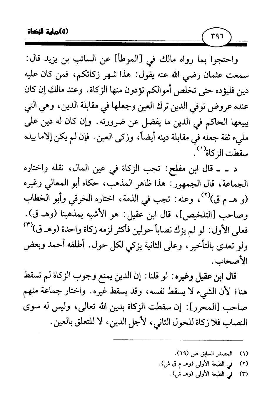 د- قال ابن مفلح: تجب الزكاة في عين المال، نقله واختاره الجماعة، قال الجمهور: هذا ظاهر المذهب، حكاه أبو المعالي وغيره (وهـ م ق) . (¬2) ، وعنه: تجب في الذمة، اختاره الخرقي وأبو الخطاب وصاحب [التلخيص] ، قال ابن عقيل: هو الأشبه بمذهبنا (وهـ ق) . فعلى الأول: لو لم يزك نصابا حولين فأكثر لزمه زكاة واحدة (وهـ ق) (¬3) ولو تعدى بالتأخير، وعلى الثانية يزكي لكل حول. أطلقه أحمد وبعض الأصحاب.