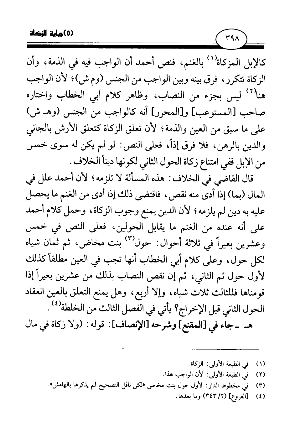 قال القاضي في الخلاف: هذه المسألة لا تلزمه؛ لأن أحمد علل في المال (بما) إذا أدى منه نقص، فاقتضى ذلك إذا أدى من الغنم ما يحصل عليه به دين لم يلزمه؛ لأن الدين يمنع وجوب الزكاة، وحمل كلام أحمد على أنه عنده من الغنم ما يقابل الحولين، فعلى النص في خمس وعشرين بعيرا في ثلاثة أحوال: حول (¬3) بنت مخاض، ثم ثمان شياه لكل حول، وعلى كلام أبي الخطاب أنها تجب في العين مطلقا كذلك لأول حول ثم الثاني، ثم إن نقص النصاب بذلك من عشرين بعيرا إذا قومناها فللثالث ثلاث شياه، وإلا أربع، وهل يمنع التعلق بالعين انعقاد الحول الثاني قبل الإخراج؟ يأتي في الفصل الثالث من الخلطة (¬4) .