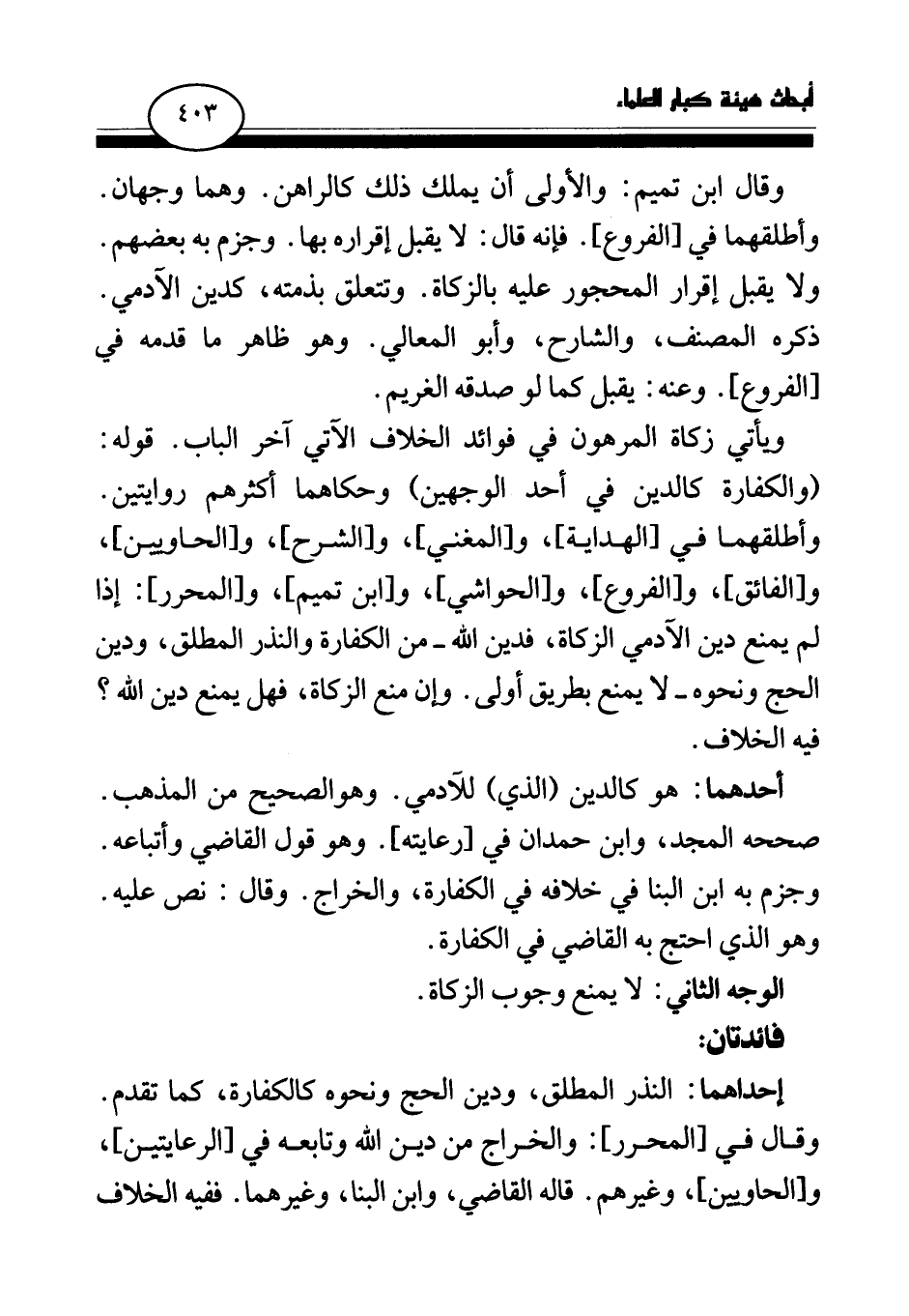 ويأتي زكاة المرهون في فوائد الخلاف الآتي آخر الباب. قوله: (والكفارة كالدين في أحد الوجهين) وحكاهما [أكثرهم] روايتين. وأطلقهما في [الهداية] ، و [المغني] ، و [الشرح] ، و [الحاويين] ، [والفائق] ، [والفروع] ، [والحواشي] ، [وابن تميم] ، [والمحرر] : إذا لم يمنع دين الآدمي الزكاة، فدين الله- من الكفارة والنذر المطلق، ودين الحج ونحوه- لا يمنع بطريق أولى. وإن منع الزكاة، فهل يمنع دين الله؛ فيه الخلاف.