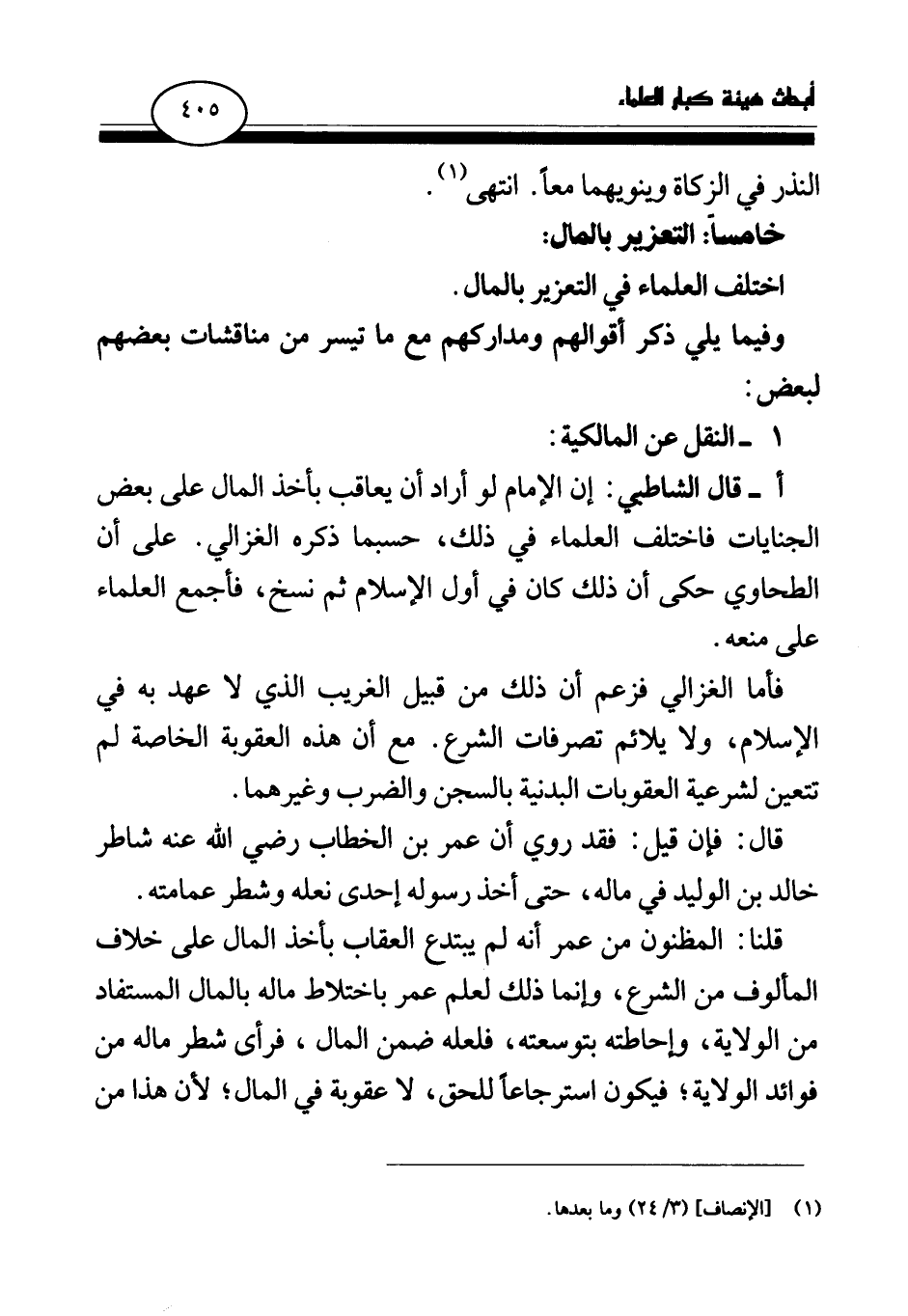 أ- قال الشاطبي: إن الإمام لو أراد أن يعاقب بأخذ المال على بعض الجنايات فاختلف العلماء في ذلك، حسبما ذكره الغزالي. على أن الطحاوي حكى أن ذلك كان في أول الإسلام ثم نسخ، فأجمع العلماء على منعه.
