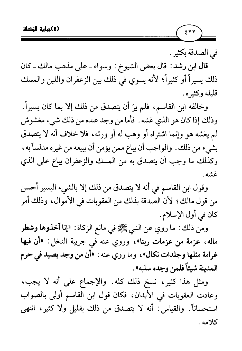 ومثل هذا كثير، نسخ ذلك كله. والإجماع على أنه لا يجب، وعادت العقوبات في الأبدان، فكان قول ابن القاسم أولى بالصواب استحسانا. والقياس: أنه لا يتصدق من ذلك بقليل ولا كثير، انتهى كلامه.