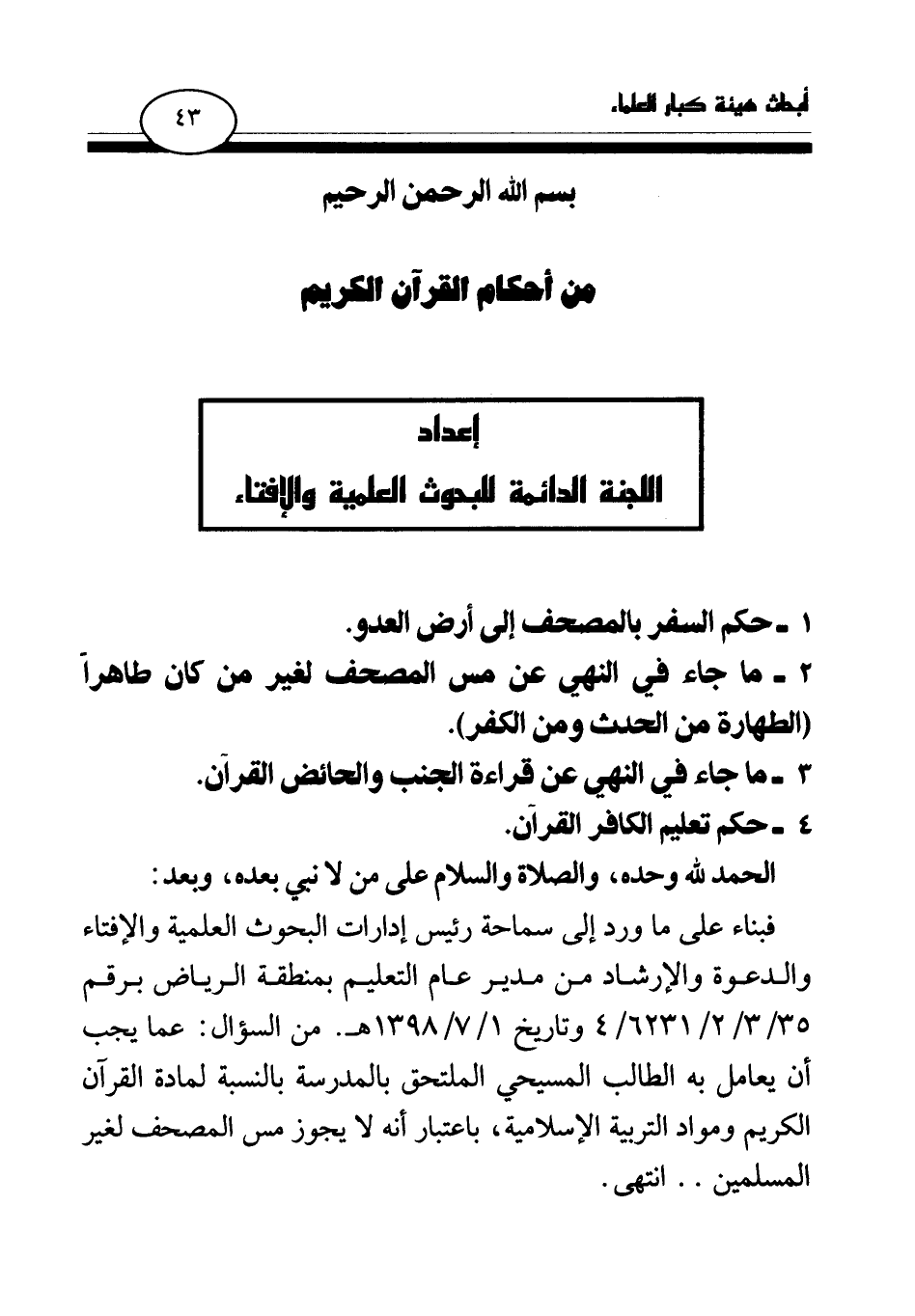 فبناء على ما ورد إلى سماحة رئيس إدارات البحوث العلمية والإفتاء والدعوة والإرشاد من مدير عام التعليم بمنطقة الرياض برقم 35 \ 3 \ 2 \ 6231 \ 4 وتاريخ 1 \ 7 \ 1398 هـ. من السؤال: عما يجب أن يعامل به الطالب المسيحي الملتحق بالمدرسة بالنسبة لمادة القرآن الكريم ومواد التربية الإسلامية، باعتبار أنه لا يجوز مس المصحف لغير المسلمين. . انتهى.