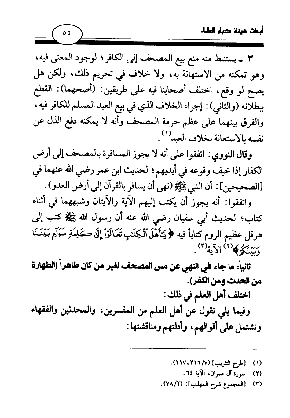 3 - يستنبط منه منع بيع المصحف إلى الكافر؛ لوجود المعنى فيه، وهو تمكنه من الاستهانة به، ولا خلاف في تحريم ذلك، ولكن هل يصح لو وقع، اختلف أصحابنا فيه على طريقين: (أصحهما) : القطع ببطلانه (والثاني) : إجراء الخلاف الذي في بيع العبد المسلم للكافر فيه، والفرق بينهما على عظم حرمة المصحف وأنه لا يمكنه دفع الذل عن نفسه بالاستعانة بخلاف العبد (¬1) .