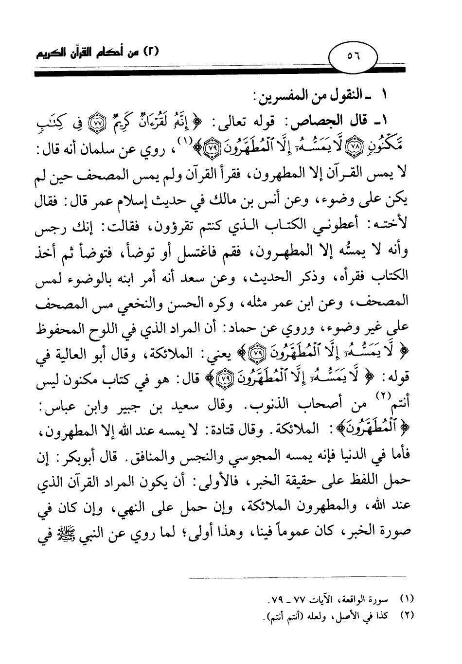 1 - قال الجصاص: قوله تعالى: {إِنَّهُ لَقُرْآنٌ كَرِيمٌ} (¬1) {فِي كِتَابٍ مَكْنُونٍ} (¬2) {لَا يَمَسُّهُ إِلَّا الْمُطَهَّرُونَ} (¬3) روي عن سلمان أنه قال: لا يمس القرآن إلا المطهرون، فقرأ القرآن ولم يمس المصحف حين لم يكن على وضوء، وعن أنس بن مالك في حديث إسلام عمر قال: فقال لأخته: أعطوني الكتاب الذي كنتم تقرءون، فقالت: إنك رجس وأنه لا يمسه إلا المطهرون، فقم فاغتسل أو توضأ، فتوضأ ثم أخذ الكتاب فقرأه، وذكر الحديث، وعن سعد أنه أمر ابنه بالوضوء لمس المصحف، وعن ابن عمر مثله، وكره الحسن والنخعي مس المصحف على غير وضوء، وروي عن حماد: أن المراد الذي في اللوح المحفوظ {لَا يَمَسُّهُ إِلَّا الْمُطَهَّرُونَ} (¬4) يعني: الملائكة، وقال أبو العالية في قوله: {لَا يَمَسُّهُ إِلَّا الْمُطَهَّرُونَ} (¬5) قال: هو في كتاب مكنون ليس أنتم (¬6) من أصحاب الذنوب. وقال سعيد بن جبير وابن عباس: {الْمُطَهَّرُونَ} (¬7) الملائكة. وقال قتادة: لا يمسه عند الله إلا المطهرون، فأما في الدنيا فإنه يمسه المجوسي والنجس والمنافق. قال أبو بكر: إن حمل اللفظ على حقيقة الخبر، فالأولى: أن يكون المراد القرآن الذي عند الله، والمطهرون الملائكة، وإن حمل على النهي، وإن كان في صورة الخبر، كان عموما فينا، وهذا أولى؛ لما روي عن النبي صلى الله عليه وسلم في