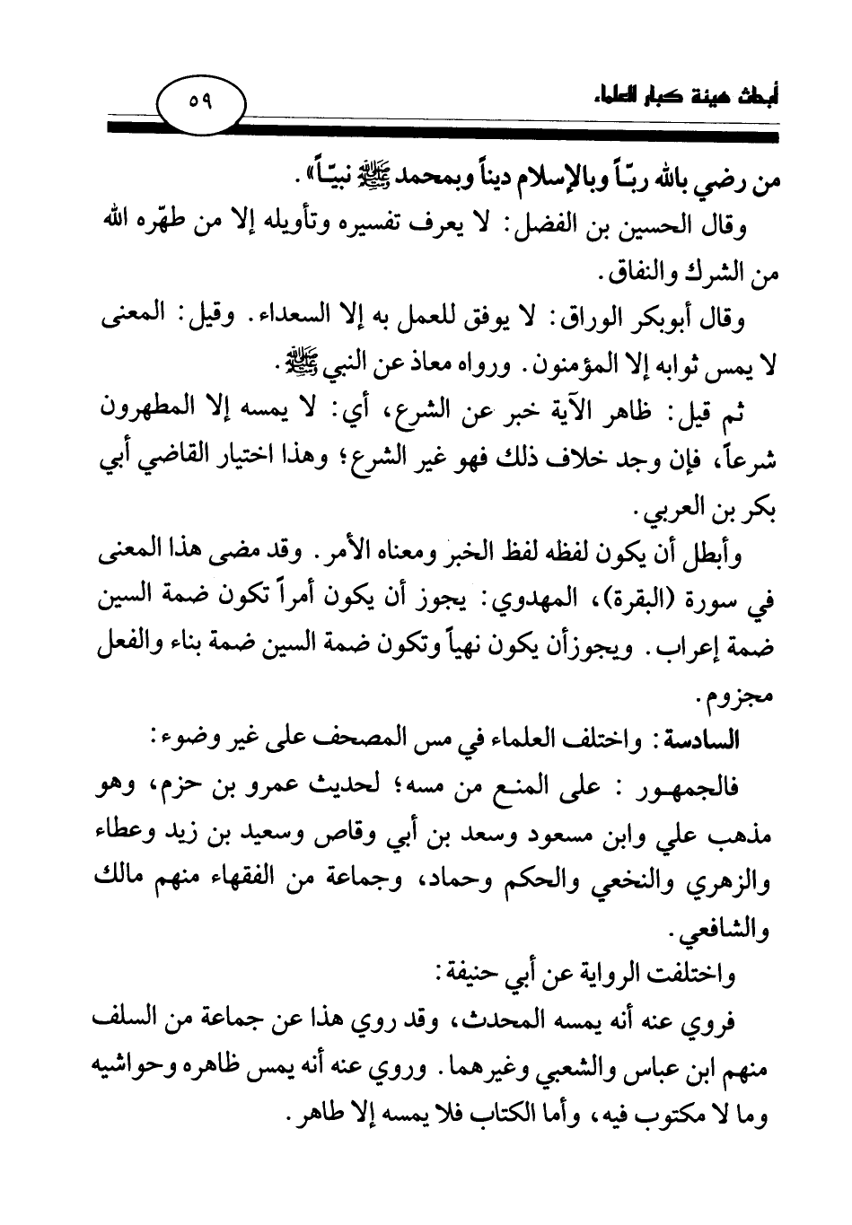 السادسة: واختلف العلماء في مس المصحف على غير وضوء: