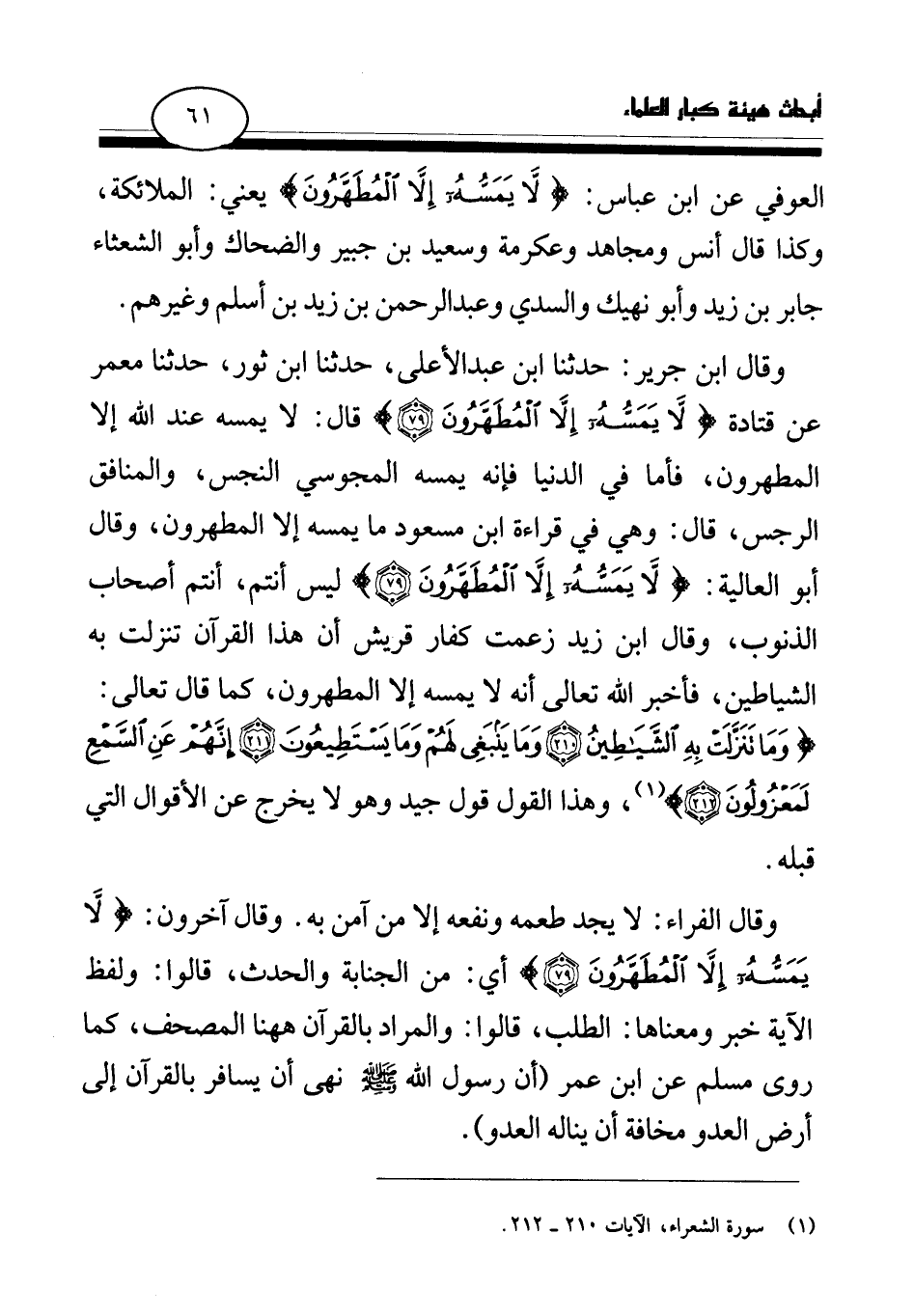 وقال ابن جرير: حدثنا ابن عبد الأعلى، حدثنا ابن ثور، حدثنا معمر عن قتادة {لَا يَمَسُّهُ إِلَّا الْمُطَهَّرُونَ} (¬2) قال: لا يمسه عند الله إلا المطهرون، فأما في الدنيا فإنه يمسه المجوسي النجس، والمنافق الرجس، قال: وهي في قراءة ابن مسعود ما يمسه إلا المطهرون، وقال أبو العالية: {لَا يَمَسُّهُ إِلَّا الْمُطَهَّرُونَ} (¬3) ليس أنتم، أنتم أصحاب الذنوب، وقال ابن زيد زعمت كفار قريش أن هذا القرآن تنزلت به الشياطين، فأخبر الله تعالى أنه لا يمسه إلا المطهرون، كما قال تعالى: {وَمَا تَنَزَّلَتْ بِهِ الشَّيَاطِينُ} (¬4) {وَمَا يَنْبَغِي لَهُمْ وَمَا يَسْتَطِيعُونَ} (¬5) {إِنَّهُمْ عَنِ السَّمْعِ لَمَعْزُولُونَ} (¬6) وهذا القول قول جيد وهو لا يخرج عن الأقوال التي قبله.