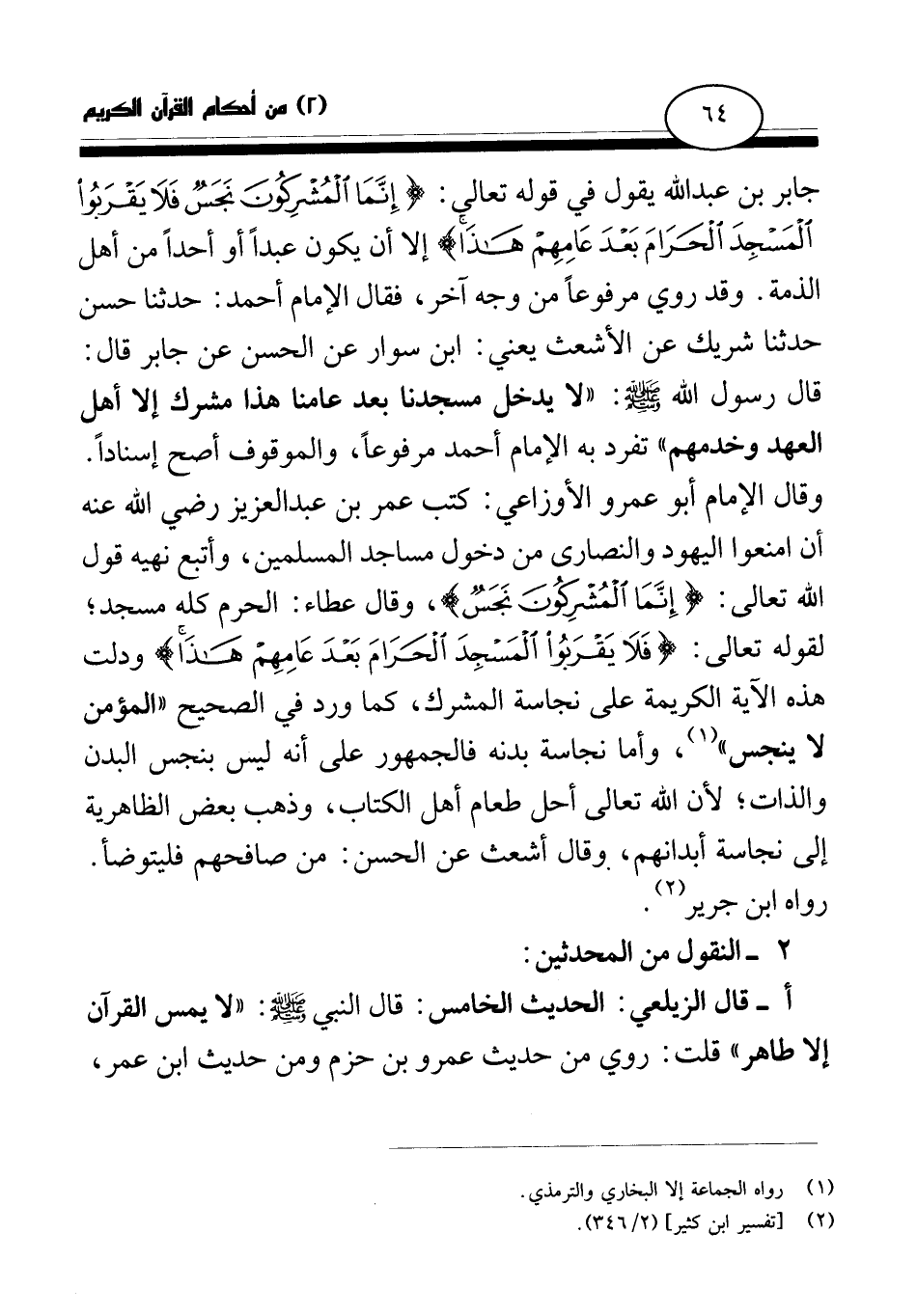 جابر بن عبد الله يقول في قوله تعالى: {يَا أَيُّهَا الَّذِينَ آمَنُوا إِنَّمَا الْمُشْرِكُونَ نَجَسٌ فَلا يَقْرَبُوا الْمَسْجِدَ الْحَرَامَ بَعْدَ عَامِهِمْ هَذَا} (¬1) إلا أن يكون عبدا أو أحدا من أهل الذمة. وقد روي مرفوعا من وجه آخر، فقال الإمام أحمد: حدثنا حسن، حدثنا شريك عن الأشعث يعني: ابن سوار عن الحسن، عن جابر قال: قال رسول الله صلى الله عليه وسلم: «لا يدخل مسجدنا بعد عامنا هذا مشرك إلا أهل العهد وخدمهم (¬2) » تفرد به الإمام أحمد مرفوعا، والموقوف أصح إسنادا. وقال الإمام أبو عمرو الأوزاعي: كتب عمر بن عبد العزيز - رضي الله عنه - أن امنعوا اليهود والنصارى من دخول مساجد المسلمين، وأتبع نهيه قول الله تعالى: {إِنَّمَا الْمُشْرِكُونَ نَجَسٌ} (¬3) وقال عطاء: الحرم كله مسجد؛ لقوله تعالى: {فَلَا يَقْرَبُوا الْمَسْجِدَ الْحَرَامَ بَعْدَ عَامِهِمْ هَذَا} (¬4) ودلت هذه الآية الكريمة على نجاسة المشرك، كما ورد في الصحيح «المؤمن لا ينجس (¬5) » ، وأما نجاسة بدنه فالجمهور على أنه ليس بنجس البدن والذات؛ لأن الله تعالى أحل طعام أهل الكتاب، وذهب بعض الظاهرية إلى نجاسة أبدانهم، وقال أشعث عن الحسن: من صافحهم فليتوضأ. رواه ابن جرير (¬6) .
