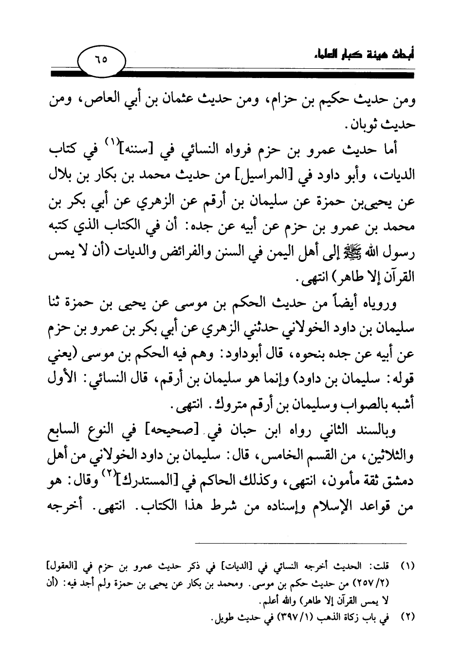 أما حديث عمرو بن حزم فرواه النسائي في [سننه] ، في كتاب الديات، وأبو داود في [المراسيل] من حديث محمد بن بكار بن بلال عن يحيى بن حمزة عن سليمان بن أرقم، عن الزهري، عن أبي بكر بن محمد بن عمرو بن حزم، عن أبيه عن جده: أن في الكتاب الذي كتبه رسول الله - صلى الله عليه وسلم - إلى أهل اليمن في السنن والفرائض والديات «أن لا يمس القرآن إلا طاهر (¬1) » انتهى.