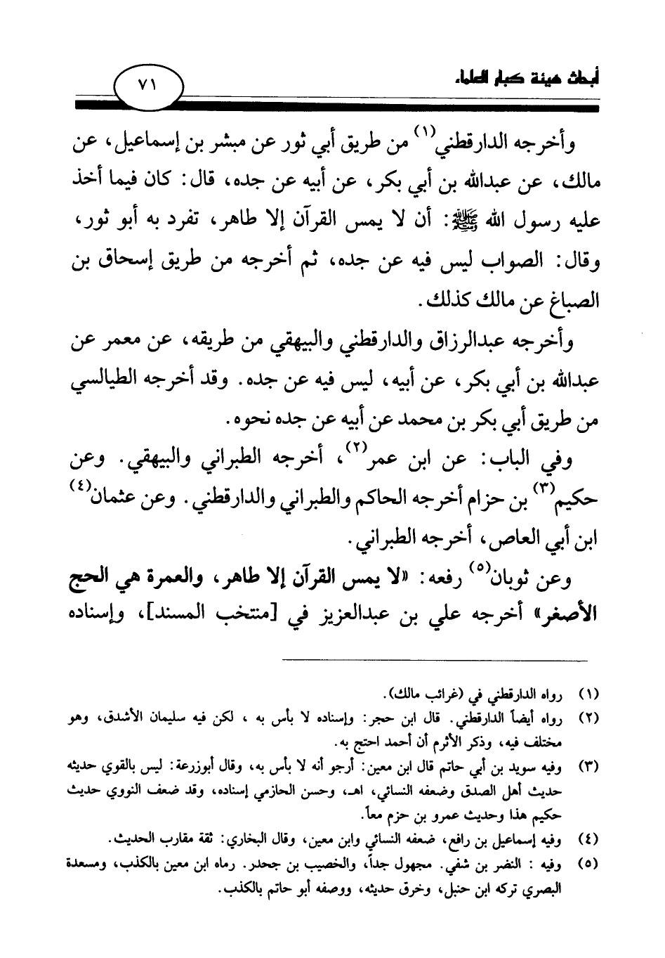 وعن ثوبان رفعه: «لا يمس القرآن إلا طاهر، والعمرة هي الحج الأصغر (¬4) » أخرجه علي بن عبد العزيز في [منتخب المسند] ، وإسناده