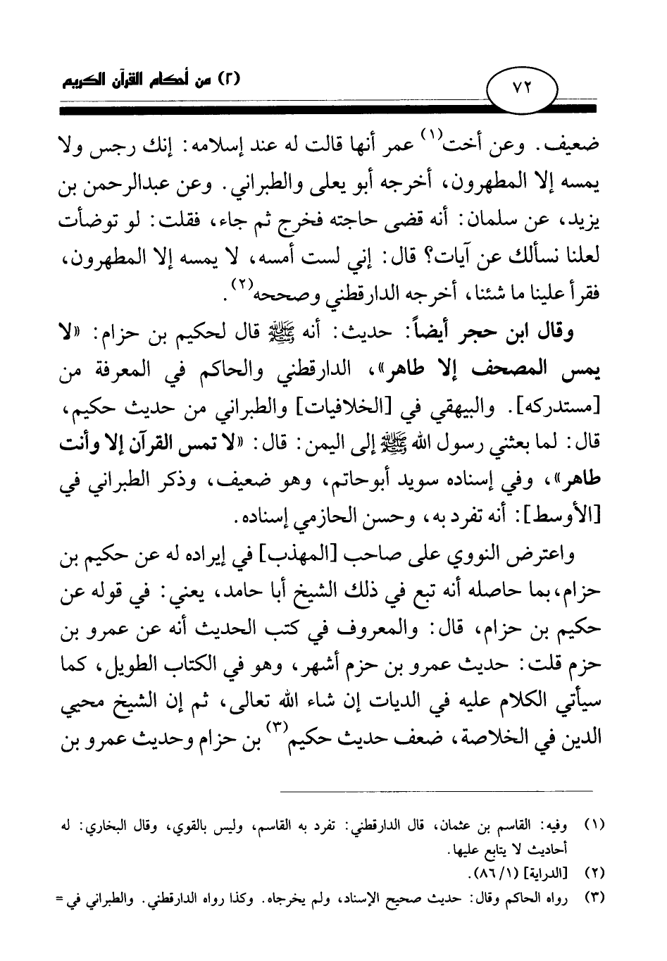 وقال ابن حجر أيضا: حديث: أنه - صلى الله عليه وسلم - قال لحكيم بن حزام: «لا يمس المصحف إلا طاهر (¬2) » ، الدارقطني والحاكم في المعرفة من [مستدركه] . والبيهقي في [الخلافيات] والطبراني من حديث حكيم، قال: لما بعثني رسول الله - صلى الله عليه وسلم - إلى اليمن: قال: «لا تمس القرآن إلا وأنت طاهر» ، وفي إسناده سويد أبو حاتم، وهو ضعيف، وذكر الطبراني في [الأوسط] : أنه تفرد به، وحسن الحازمي إسناده.