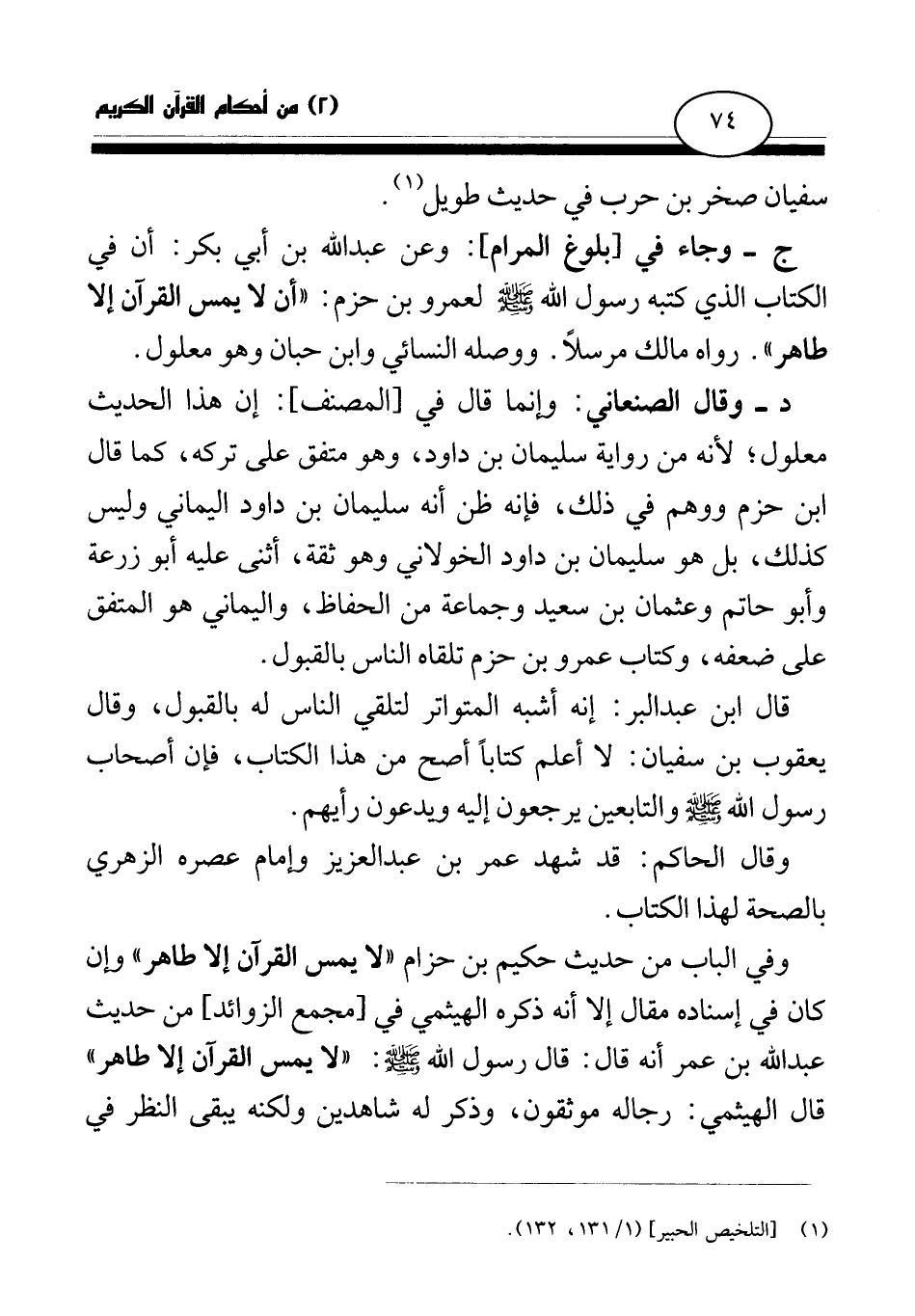 ج- وجاء في [بلوغ المرام] : وعن عبد الله بن أبي بكر: أن في الكتاب الذي كتبه رسول الله - صلى الله عليه وسلم - لعمرو بن حزم: «أن لا يمس القرآن إلا طاهر (¬2) » . رواه مالك مرسلا. ووصله النسائي وابن حبان وهو معلول.