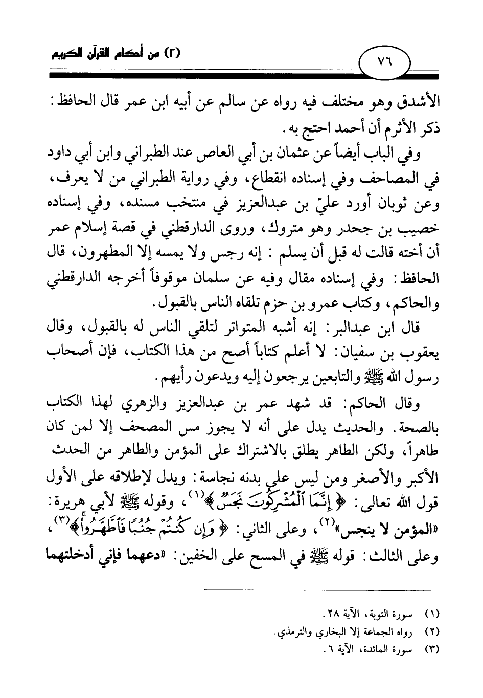 وقال الحاكم: قد شهد عمر بن عبد العزيز والزهري لهذا الكتاب بالصحة. والحديث يدل على أنه لا يجوز مس المصحف إلا لمن كان طاهرا، ولكن الطاهر يطلق بالاشتراك على المؤمن، والطاهر من الحدث الأكبر والأصغر ومن ليس على بدنه نجاسة: ويدل لإطلاقه على الأول قول الله تعالى: {إِنَّمَا الْمُشْرِكُونَ نَجَسٌ} (¬1) وقوله - صلى الله عليه وسلم - لأبي هريرة: «المؤمن لا ينجس (¬2) » ، وعلى الثاني: {وَإِنْ كُنْتُمْ جُنُبًا فَاطَّهَّرُوا} (¬3) وعلى الثالث: قوله - صلى الله عليه وسلم - في المسح على الخفين: «دعهما فإني أدخلتهما
