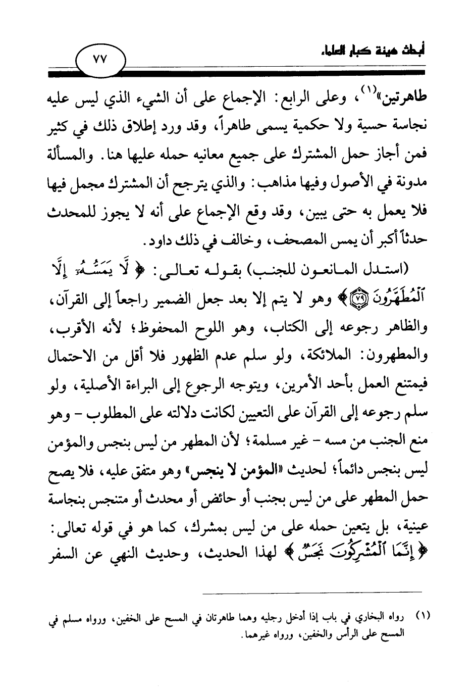 طاهرتين (¬1) » ، وعلى الرابع: الإجماع على أن الشيء الذي ليس عليه نجاسة حسية ولا حكمية يسمى طاهرا، وقد ورد إطلاق ذلك في كثير فمن أجاز حمل المشترك على جميع معانيه حمله عليها هنا. والمسألة مدونة في الأصول وفيها مذاهب: والذي يترجح أن المشترك مجمل فيها فلا يعمل به حتى يبين، وقد وقع الإجماع على أنه لا يجوز للمحدث حدثا أكبر أن يمس المصحف، وخالف في ذلك داود.