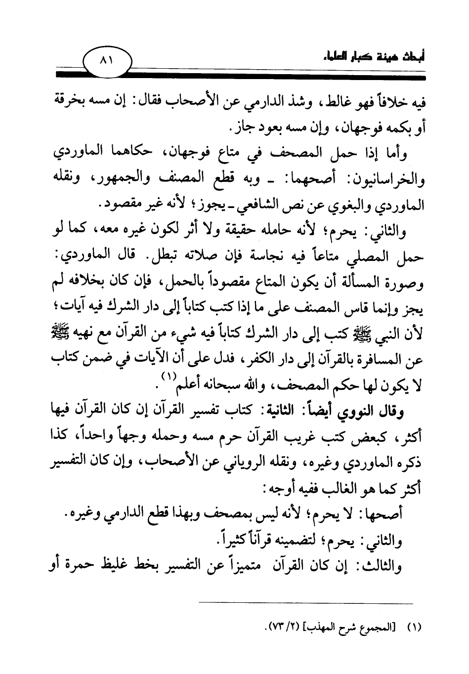 وقال النووي أيضا: الثانية: كتاب تفسير القرآن إن كان القرآن فيها أكثر، كبعض كتب غريب القرآن حرم مسه وحمله وجها واحدا، كذا ذكره الماوردي وغيره، ونقله الروياني عن الأصحاب، وإن كان التفسير أكثر كما هو الغالب ففيه أوجه: