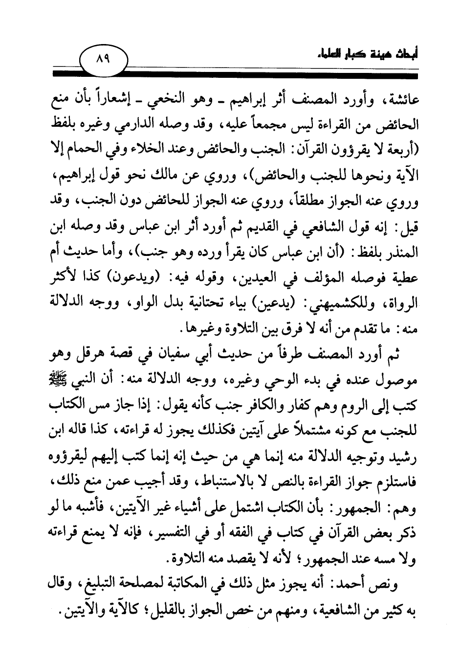 ثم أورد المصنف طرفا من حديث أبي سفيان في قصة هرقل وهو موصول عنده في بدء الوحي وغيره، ووجه الدلالة منه: أن النبي - صلى الله عليه وسلم - كتب إلى الروم وهم كفار، والكافر جنب كأنه يقول: إذا جاز مس الكتاب للجنب مع كونه مشتملا على آيتين فكذلك يجوز له قراءته، كذا قاله ابن رشيد وتوجيه الدلالة منه إنما هي من حيث إنه إنما كتب إليهم ليقرءوه فاستلزم جواز القراءة بالنص لا بالاستنباط، وقد أجيب عمن منع ذلك، وهم: الجمهور: بأن الكتاب اشتمل على أشياء غير الآيتين، فأشبه ما لو ذكر بعض القرآن في كتاب في الفقه أو في التفسير، فإنه لا يمنع قراءته ولا مسه عند الجمهور؛ لأنه لا يقصد منه التلاوة.