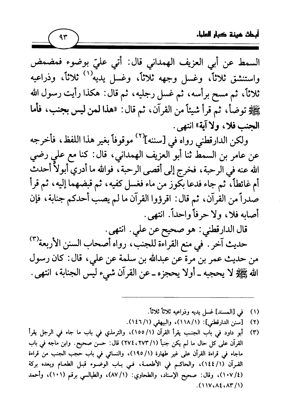 ولكن الدارقطني رواه في [سننه] (¬2) موقوفا بغير هذا اللفظ، فأخرجه عن عامر بن السمط ثنا أبو العزيف الهمداني، قال: كنا مع علي - رضي الله عنه - في الرحبة، فخرج إلى أقصى الرحبة، فوالله ما أدري أبولا أحدث أم غائطا، ثم جاء فدعا بكوز من ماء فغسل كفيه، ثم قبضهما إليه، ثم قرأ صدرا من القرآن، ثم قال: اقرءوا القرآن ما لم يصب أحدكم جنابة، فإن أصابه فلا، ولا حرفا واحدا. انتهى.