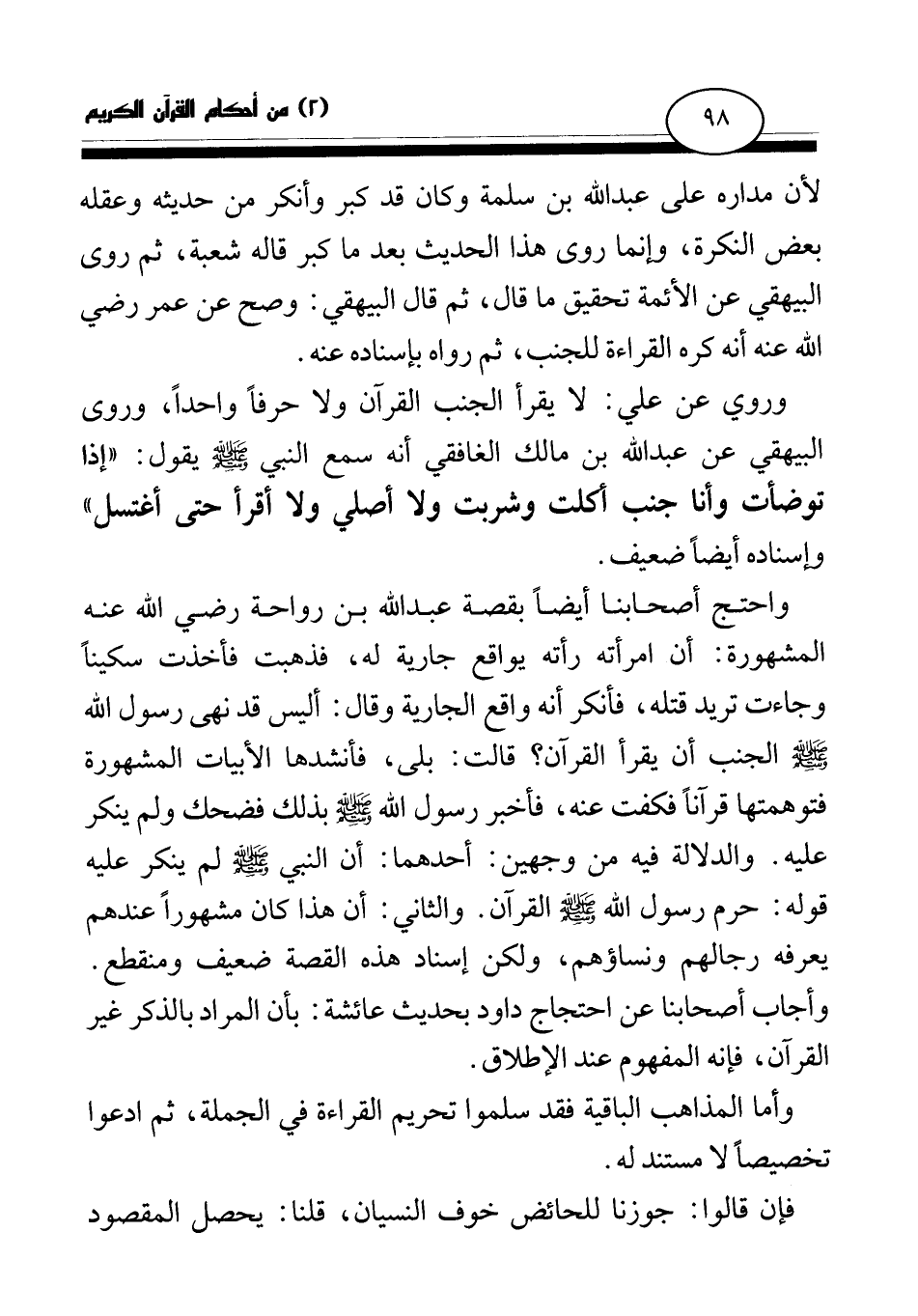واحتج أصحابنا أيضا بقصة عبد الله بن رواحة - رضي الله عنه - المشهورة: أن امرأته رأته يواقع جارية له، فذهبت فأخذت سكينا وجاءت تريد قتله، فأنكر أنه واقع الجارية، وقال: أليس قد نهى رسول الله - صلى الله عليه وسلم - الجنب أن يقرأ القرآن؟ قالت: بلى، فأنشدها الأبيات المشهورة فتوهمتها قرآنا فكفت عنه، فأخبر رسول الله - صلى الله عليه وسلم - بذلك فضحك ولم ينكر عليه. والدلالة فيه من وجهين: أحدهما: أن النبي - صلى الله عليه وسلم - لم ينكر عليه قوله: حرم رسول الله - صلى الله عليه وسلم - القرآن. والثاني: أن هذا كان مشهورا عندهم يعرفه رجالهم ونساؤهم، ولكن إسناد هذه القصة ضعيف ومنقطع. وأجاب أصحابنا عن احتجاج داود بحديث عائشة: بأن المراد بالذكر غير القرآن، فإنه المفهوم عند الإطلاق.