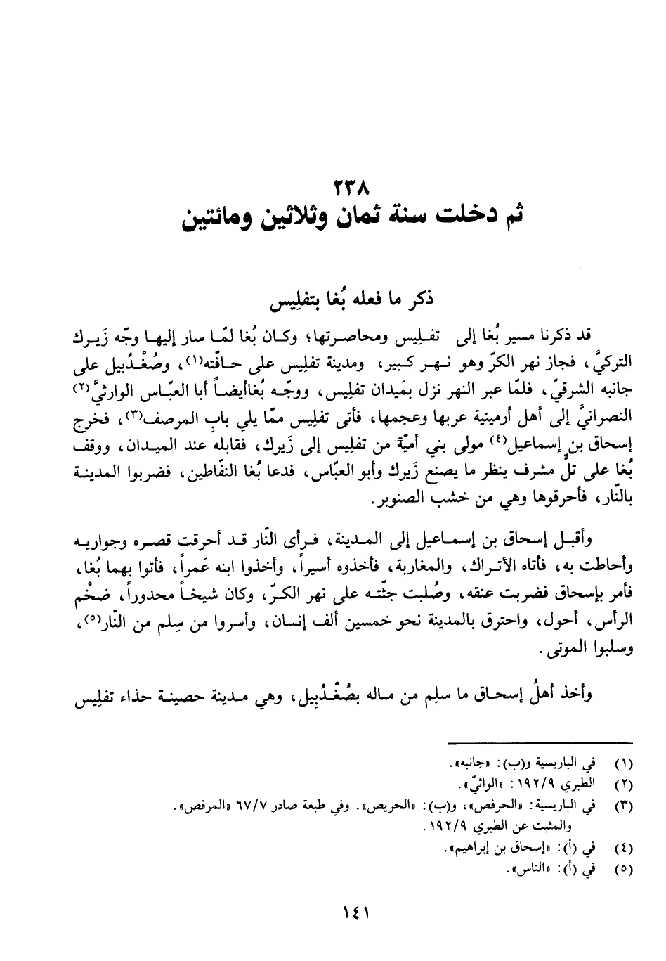 قَدْ ذَكَرْنَا مَسِيرَ بُغَا إِلَى تَفْلِيسَ، وَمُحَاصَرَتَهَا، وَكَانَ بُغَا لَمَّا سَارَ إِلَيْهَا وَجَّهَ زِيرِكَ التُّرْكِيَّ، فَجَازَ نَهْرَ الْكَرِّ، وَهُوَ نَهْرٌ كَبِيرٌ، وَمَدِينَةُ تَفْلِيسَ عَلَى حَافَّتِهِ، وَصغدبيلُ عَلَى جَانِبِهِ الشَّرْقِيِّ، فَلَمَّا عَبَرَ النَّهْرَ نَزَلَ بِمَيْدَانِ تَفْلِيسَ، وَوَجَّهَ بُغَا أَيْضًا أَبَا الْعَبَّاسِ الْوَارِثِيَّ النَّصْرَانِيَّ إِلَى أَهْلِ أَرْمِينِيَّةَ عَرَبِهَا وَعَجَمِهَا، فَأَتَى تَفْلِيسَ مِمَّا يَلِي بَابَ الْمُرَصَّفِ، فَخَرَجَ إِسْحَاقُ بْنُ إِسْمَاعِيلَ مَوْلَى بَنِي أُمَيَّةَ مِنْ تَفْلِيسَ إِلَى زِيرِكَ، فَقَابَلَهُ عِنْدَ الْمَيْدَانِ، وَوَقَفَ بُغَا عَلَى تَلٍّ مُشْرِفٍ يَنْظُرُ مَا يَصْنَعُ زِيرِكُ وَأَبُو الْعَبَّاسِ، فَدَعَا بُغَا النَّفَّاطِينَ، فَضَرَبُوا الْمَدِينَةَ بِالنَّارِ، فَأَحْرَقُوهَا وَهِيَ مِنْ خَشَبِ الصَّنَوْبَرِ.