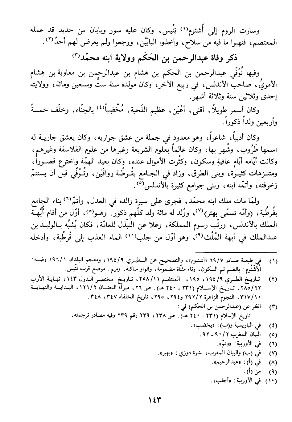 وَلَمَّا مَاتَ مَلَكَ ابْنَهُ مُحَمَّدٌ، فَجَرَى عَلَى سِيرَةِ وَالِدِهِ فِي الْعَدْلِ، وَأَتَمَّ بِنَاءَ الْجَامِعِ بِقُرْطُبَةَ، (وَأَمُّهُ تُسَمَّى بُهْتُرَ) ، وَوُلِدَ لَهُ مِائَةُ وَلَدٍ كُلُّهُمْ ذُكُورٌ، وَهُوَ أَوَّلُ مَنْ أَقَامَ أُبَّهَةَ الْمُلْكِ بِالْأَنْدَلُسِ، وَرَتَّبَ رُسُومَ الْمَمْلَكَةِ، وَعَلَا عَنِ التَّبَذُّلِ لِلْعَامَّةِ، فَكَانَ يُشَبَّهُ بِالْوَلِيدِ بْنِ عَبْدِ الْمَلِكِ فِي أُبَّهَةِ الْمُلْكِ، وَهُوَ أَوَّلُ مَنْ جَلَبَ الْمَاءَ الْعَذْبَ إِلَى قُرْطُبَةَ، وَأَدْخَلَهُ