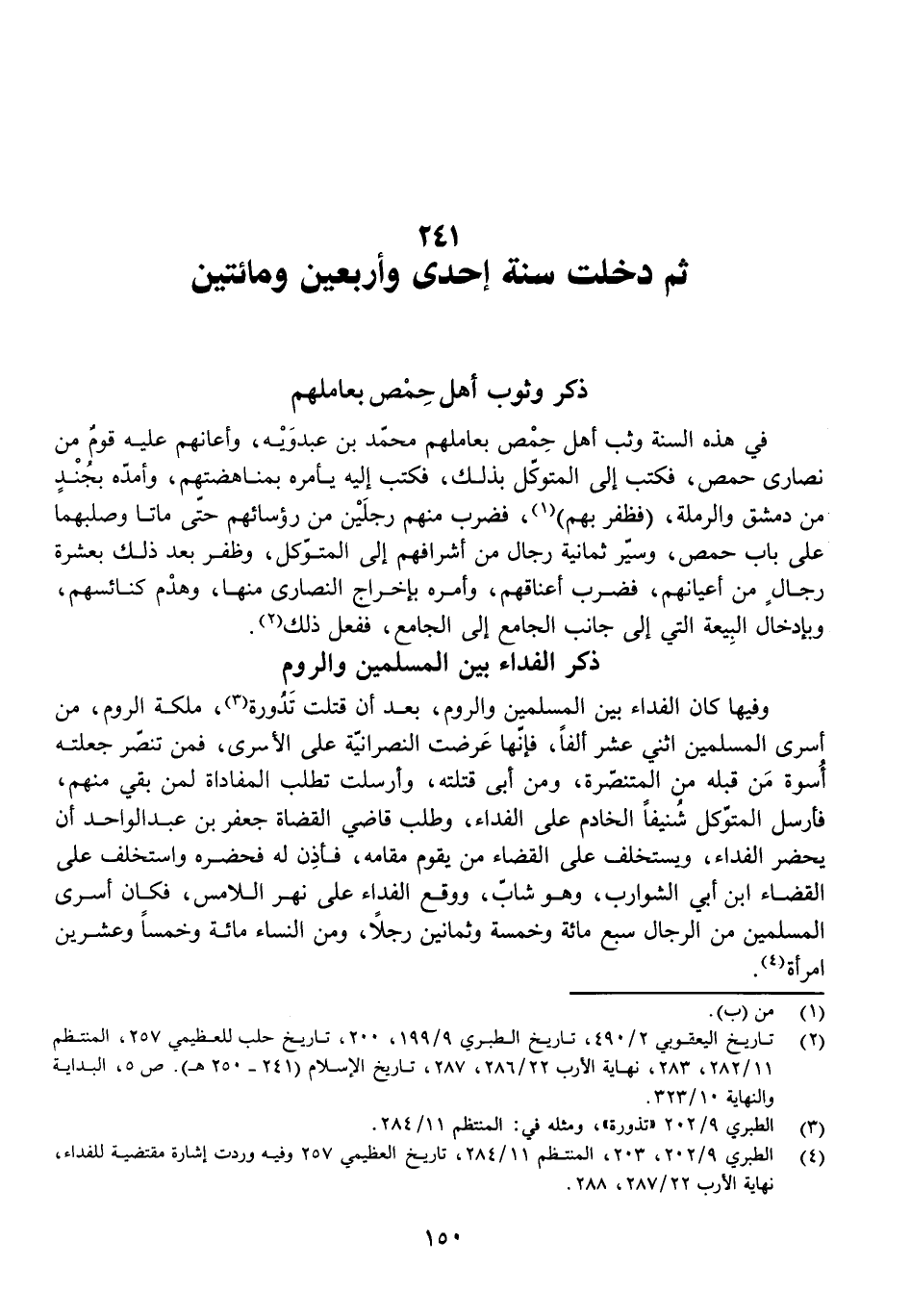 وَفِيهَا كَانَ الْفِدَاءُ بَيْنَ الْمُسْلِمِينَ وَالرُّومِ، بَعْدَ أَنْ قَتَلَتْ تَدُورَةُ مَلِكَةُ الرُّومِ مِنْ أَسْرَى الْمُسْلِمِينَ اثْنَيْ عَشَرَ أَلْفًا، فَإِنَّهَا عَرَضَتِ النَّصْرَانِيَّةَ عَلَى الْأَسْرَى، فَمَنْ تَنَصَّرَ جَعَلَتْهُ أُسْوَةَ مَنْ قَبْلَهُ مِنَ الْمُتَنَصِّرَةِ، وَمَنْ أَبَى قَتَلَتْهُ، وَأَرْسَلَتْ تَطْلُبُ الْمُفَادَاةَ لِمَنْ بَقِيَ مِنْهُمْ، فَأَرْسَلَ الْمُتَوَكِّلُ شُنَيْفًا الْخَادِمَ عَلَى الْفِدَاءِ، وَطَلَبَ قَاضِي الْقُضَاةِ جَعْفَرُ بْنُ عَبْدِ الْوَاحِدِ أَنْ يَحْضُرَ الْفِدَاءَ، وَيَسْتَخْلِفَ عَلَى الْقَضَاءِ مَنْ يَقُومُ مَقَامَهُ، فَأَذِنَ لَهُ فَحَضَرَهُ وَاسْتَخْلَفَ عَلَى الْقَضَاءِ ابْنَ أَبِي الشَّوَارِبِ، وَهُوَ شَابٌّ، وَوَقَعَ الْفِدَاءُ عَلَى نَهْرِ اللَّامِسِ، فَكَانَ أَسْرَى الْمُسْلِمِينَ مِنَ الرِّجَالِ سَبْعَ مِائَةٍ وَخَمْسَةً وَثَمَانِينَ رَجُلًا، وَمِنَ النِّسَاءِ مِائَةً وَخَمْسًا وَعِشْرِينَ امْرَأَةً.