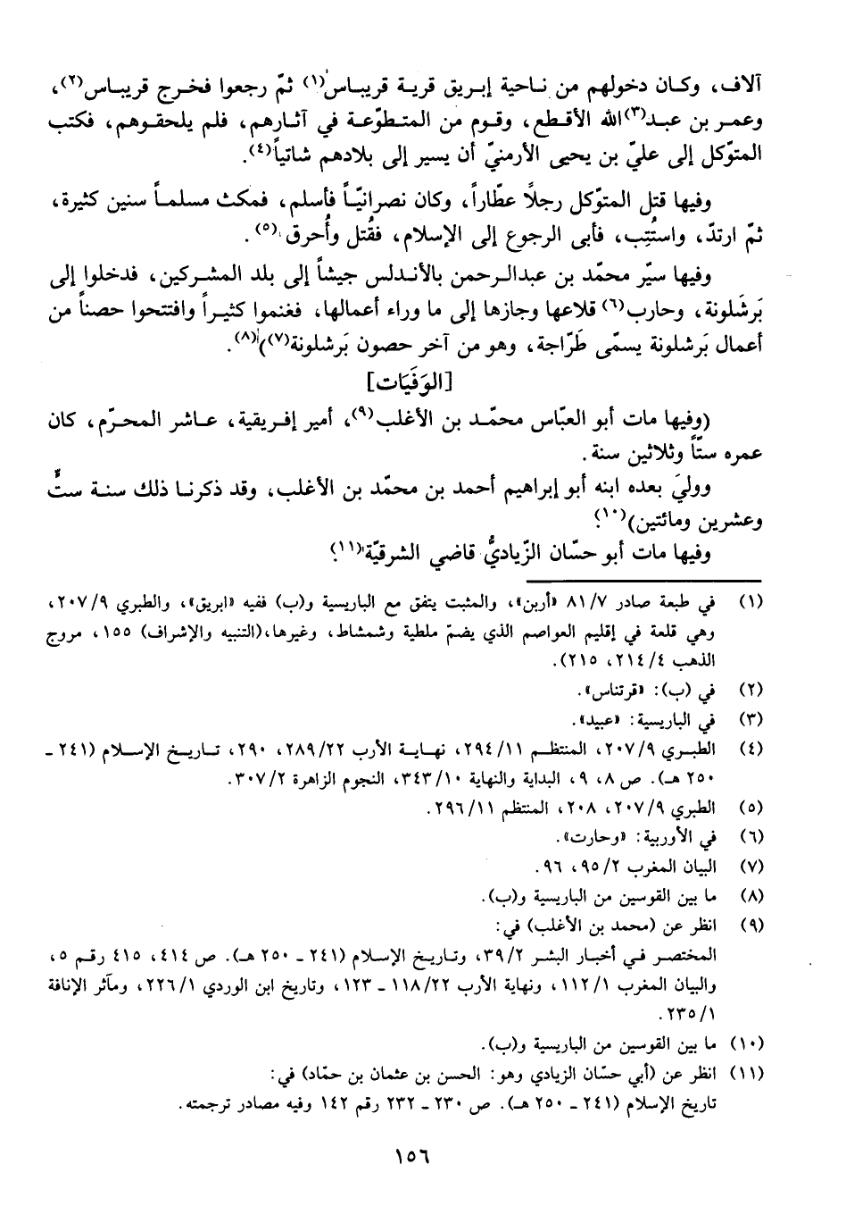(وَفِيهَا مَاتَ أَبُو الْعَبَّاسِ مُحَمَّدُ بْنُ الْأَغْلَبِ أَمِيرُ إِفْرِيقِيَّةَ عَاشِرَ الْمُحَرَّمِ، كَانَ عُمْرُهُ سِتًّا وَثَلَاثِينَ سَنَةً، وَوَلِيَ بَعْدَهُ ابْنُهُ أَبُو إِبْرَاهِيمَ أَحْمَدُ بْنُ مُحَمَّدِ بْنِ الْأَغْلَبِ، وَقَدْ ذَكَرْنَا ذَلِكَ سَنَةَ سِتٍّ وَعِشْرِينَ وَمِائَتَيْنِ) .