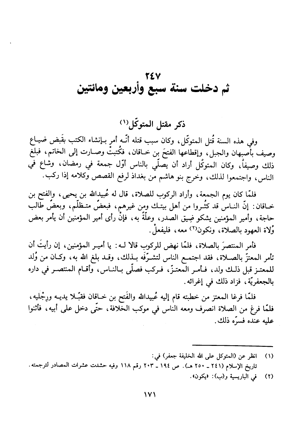 وَفِي هَذِهِ السَّنَةِ قُتِلَ الْمُتَوَكِّلُ، وَكَانَ سَبَبُ قَتْلِهِ أَنَّهُ أَمَرَ بِإِنْشَاءِ الْكُتُبِ بِقَبْضِ ضِيَاعِ وَصَيْفٍ بِأَصْبَهَانَ وَالْجَبَلِ، وَإِقْطَاعَهَا الْفَتْحَ بْنَ خَاقَانَ، فَكُتِبَتْ، وَصَارَتْ إِلَى الْخَاتَمِ، فَبَلَغَ ذَلِكَ وَصَيْفًا، وَكَانَ الْمُتَوَكِّلُ أَرَادَ أَنْ يُصَلِّيَ بِالنَّاسِ أَوَّلَ جُمْعَةٍ فِي رَمَضَانَ، وَشَاعَ فِي النَّاسِ، وَاجْتَمَعُوا لِذَلِكَ، وَخَرَجَ بَنُو هَاشِمٍ مِنْ بَغْدَادَ لِرَفْعِ الْقَصَصِ وَكَلَامِهِ إِذَا رَكِبَ.
