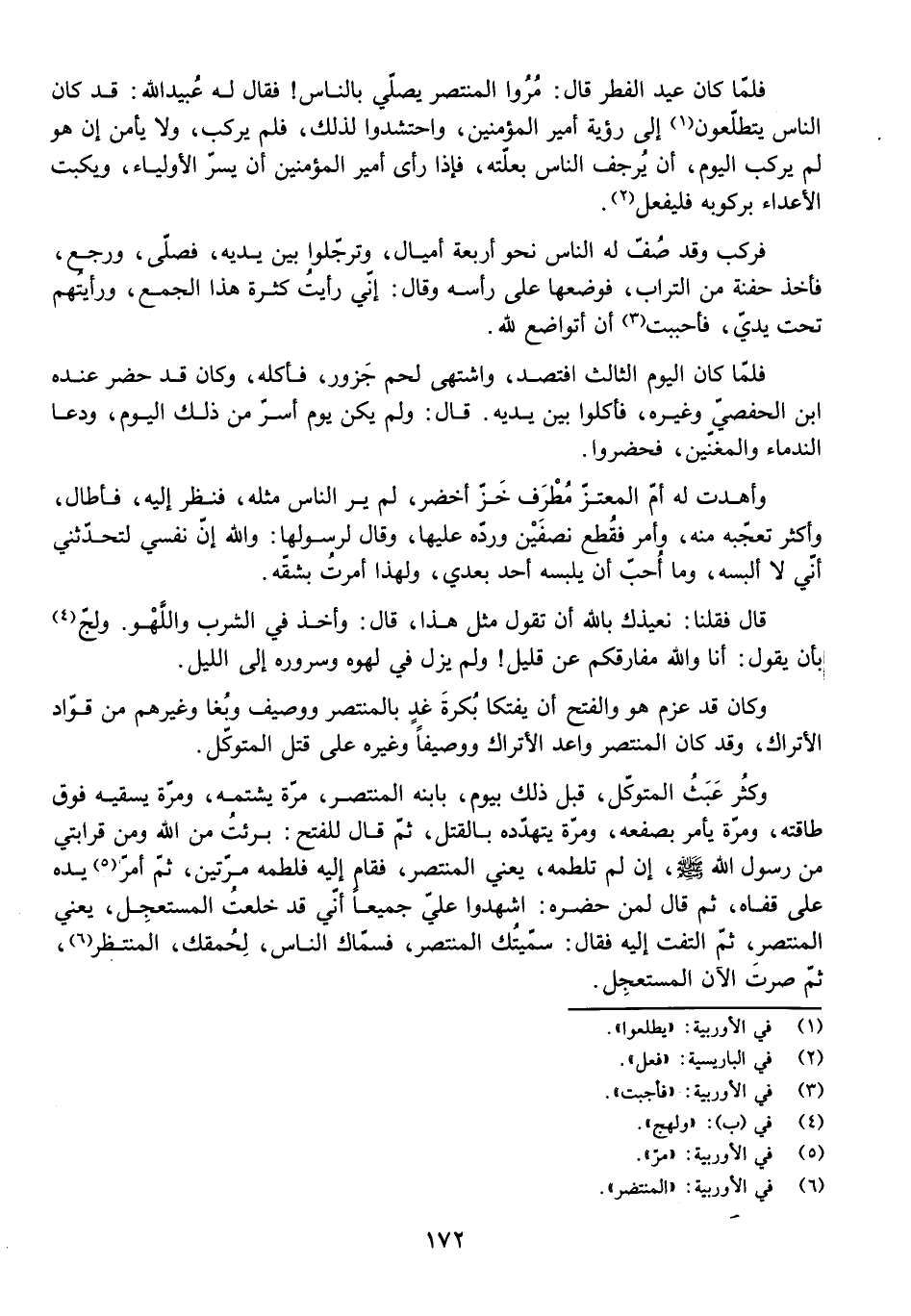 فَلَمَّا كَانَ عِيدُ الْفِطْرِ قَالَ: مُرُوا الْمُنْتَصِرَ يُصَلِّي بِالنَّاسِ! فَقَالَ لَهُ عُبَيْدُ اللَّهِ: قَدْ كَانَ النَّاسُ يَتَطَلَّعُونَ إِلَى رُؤْيَةِ أَمِيرِ الْمُؤْمِنِينَ، وَاحْتَشَدُوا لِذَلِكَ، فَلَمْ يَرْكَبْ، وَلَا يَأْمَنُ إِنْ هُوَ لَمْ يَرْكَبِ الْيَوْمَ، أَنْ يَرْجُفَ النَّاسُ بِعِلَّتِهِ، فَإِذَا رَأَى أَمِيرُ الْمُؤْمِنِينَ أَنْ يَسُرَّ الْأَوْلِيَاءَ، وَيَكْبِتَ الْأَعْدَاءَ بِرُكُوبِهِ فَلْيَفْعَلْ.