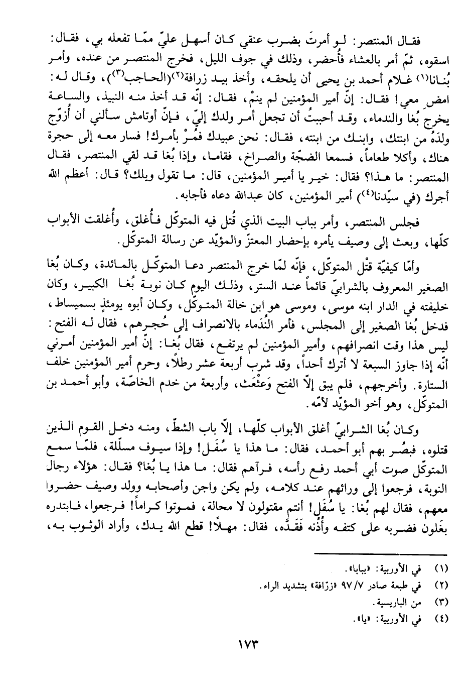 فَقَالَ الْمُنْتَصِرُ: لَوْ أَمَرْتَ بِضَرْبِ عُنُقِي كَانَ أَسْهَلَ عَلَيَّ مِمَّا تَفْعَلُهُ بِي، فَقَالَ: اسْقُوهُ، ثُمَّ أَمَرَ بِالْعَشَاءِ فَأُحْضِرَ، وَذَلِكَ فِي جَوْفِ اللَّيْلِ، فَخَرَجَ الْمُنْتَصِرُ مِنْ عِنْدِهِ، وَأَمَرَ بَنَانًا غُلَامَ أَحْمَدَ بْنِ يَحْيَى أَنْ يَلْحَقَهُ، وَأَخَذَ بِيَدِ زَرَافَةَ (الْحَاجِبِ) ، وَقَالَ لَهُ: امْضِ مَعِي! فَقَالَ: إِنَّ أَمِيرَ الْمُؤْمِنِينَ لَمْ يَنَمْ، فَقَالَ: إِنَّهُ قَدْ أَخَذَ مِنْهُ النَّبِيذَ، وَالسَّاعَةَ يَخْرُجُ بُغَا وَالنُّدَمَاءُ، وَقَدْ أَحْبَبْتُ أَنْ تَجْعَلَ أَمْرَ وَلَدِكَ إِلَيَّ، فَإِنَّ أُوتَامَشَ سَأَلَنِي أَنْ أُزَوِّجَ وَلَدَهُ مِنَ ابْنَتِكَ، وَابْنَكَ مِنِ ابْنَتِهِ، فَقَالَ: نَحْنُ عَبِيدُكَ فَمُرْ بِأَمْرِكَ! فَسَارَ مَعَهُ إِلَى حُجْرَةٍ هُنَاكَ، وَأَكَلَا طَعَامًا، فَسَمِعَا الضَّجَّةَ وَالصُّرَاخَ، فَقَامَا، وَإِذَا بُغَا قَدْ لَقِيَ الْمُنْتَصِرَ، فَقَالَ الْمُنْتَصِرُ: مَا هَذَا؟ فَقَالَ: خَيْرٌ يَا أَمِيرَ الْمُؤْمِنِينَ، قَالَ: مَا تَقَوُلُ وَيْلَكَ؟ قَالَ: أَعْظَمَ اللَّهُ أَجَرَكَ (فِي سَيِّدِنَا) أَمِيرِ الْمُؤْمِنِينَ، كَانَ عَبْدُ اللَّهِ دَعَاهُ فَأَجَابَهُ.