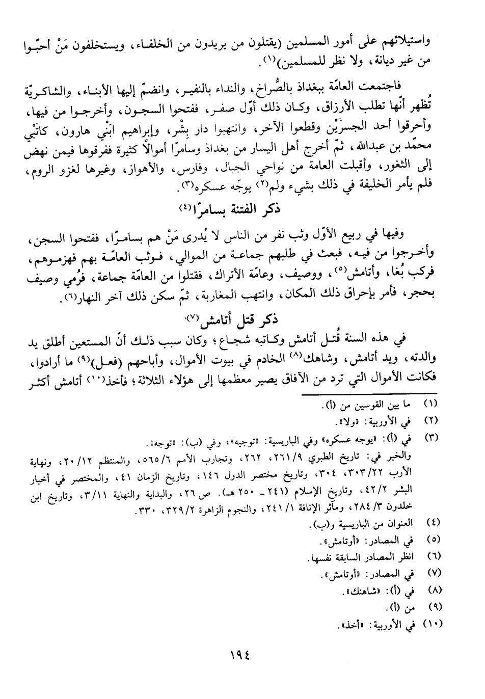 فِي هَذِهِ السَّنَةِ قُتِلَ أُتَامِشُ وَكَاتِبُهُ شُجَاعٌ، وَكَانَ سَبَبُ ذَلِكَ أَنَّ الْمُسْتَعِينَ أَطْلَقَ يَدَ وَالِدَتِهِ، وَيَدَ أُتَامِشَ، وَشَاهَكَ الْخَادِمِ فِي بُيُوتِ الْأَمْوَالِ، وَأَبَاحَهُمْ (فِعْلَ) مَا أَرَادُوا، فَكَانَتِ الْأَمْوَالُ الَّتِي تَرِدُ مِنَ الْآفَاقِ يَصِيرُ مُعْظَمُهَا إِلَى هَؤُلَاءِ الثَّلَاثَةِ، فَأَخَذَ أُتَامِشُ أَكْثَرَ